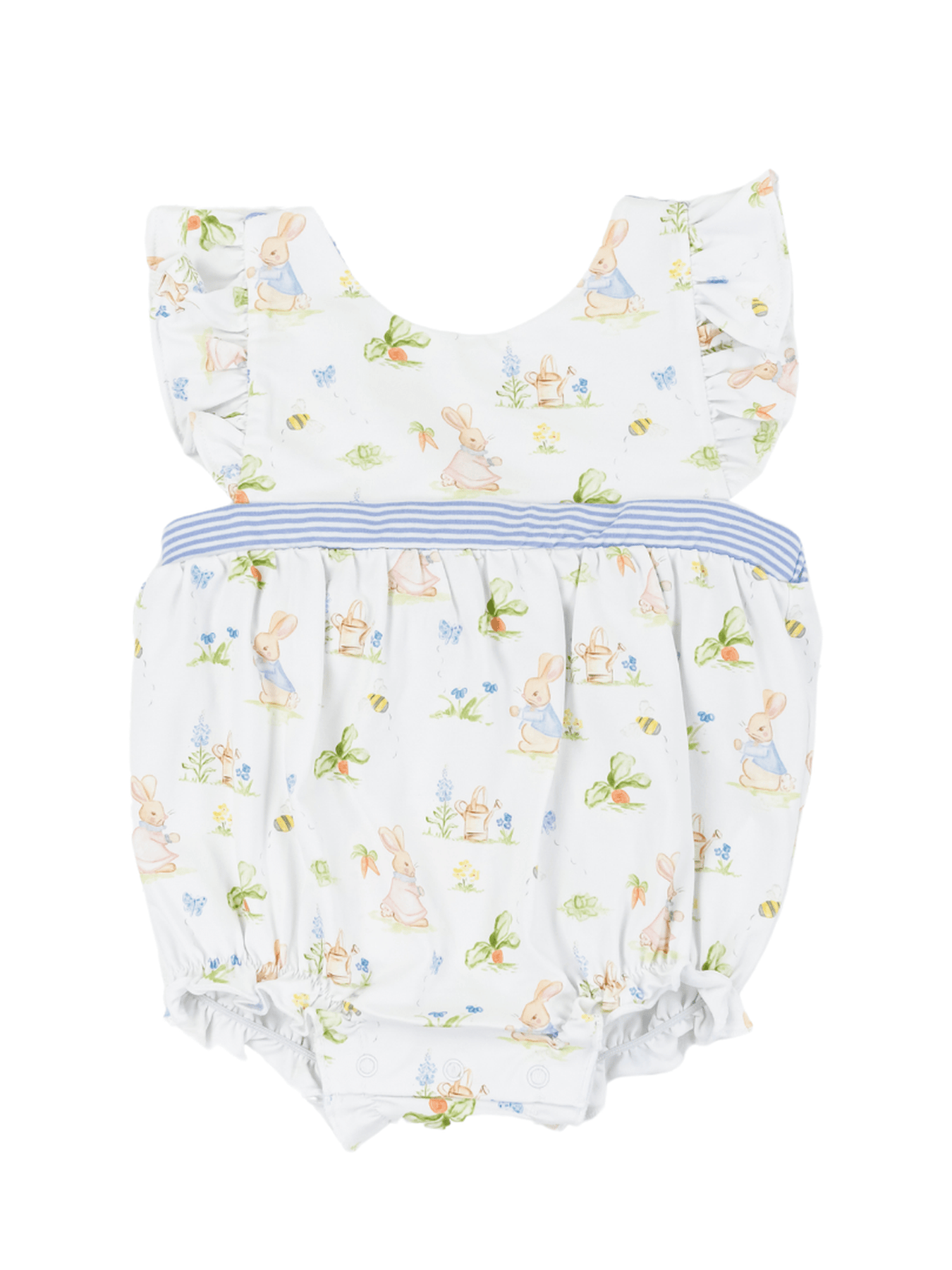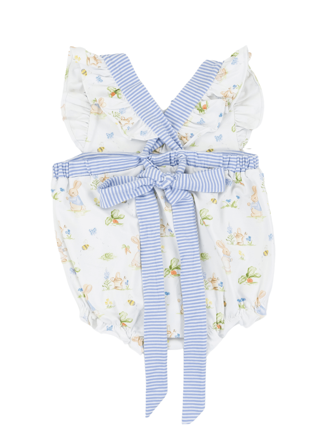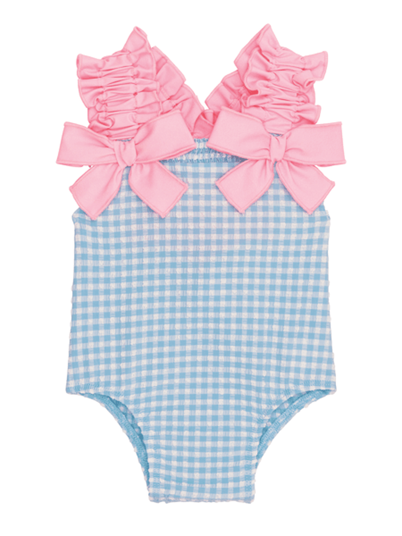 Let your little one bloom in style with the Americana Petal Playsuit- a sweet bubble crafted in a floral print. The blue check trim on the petal collar contrasts beautifully with the floral, and is repeated on large side bows. The breathable fabric keeps her cool while the playful botanical design brings joy to every outing. Stunning!