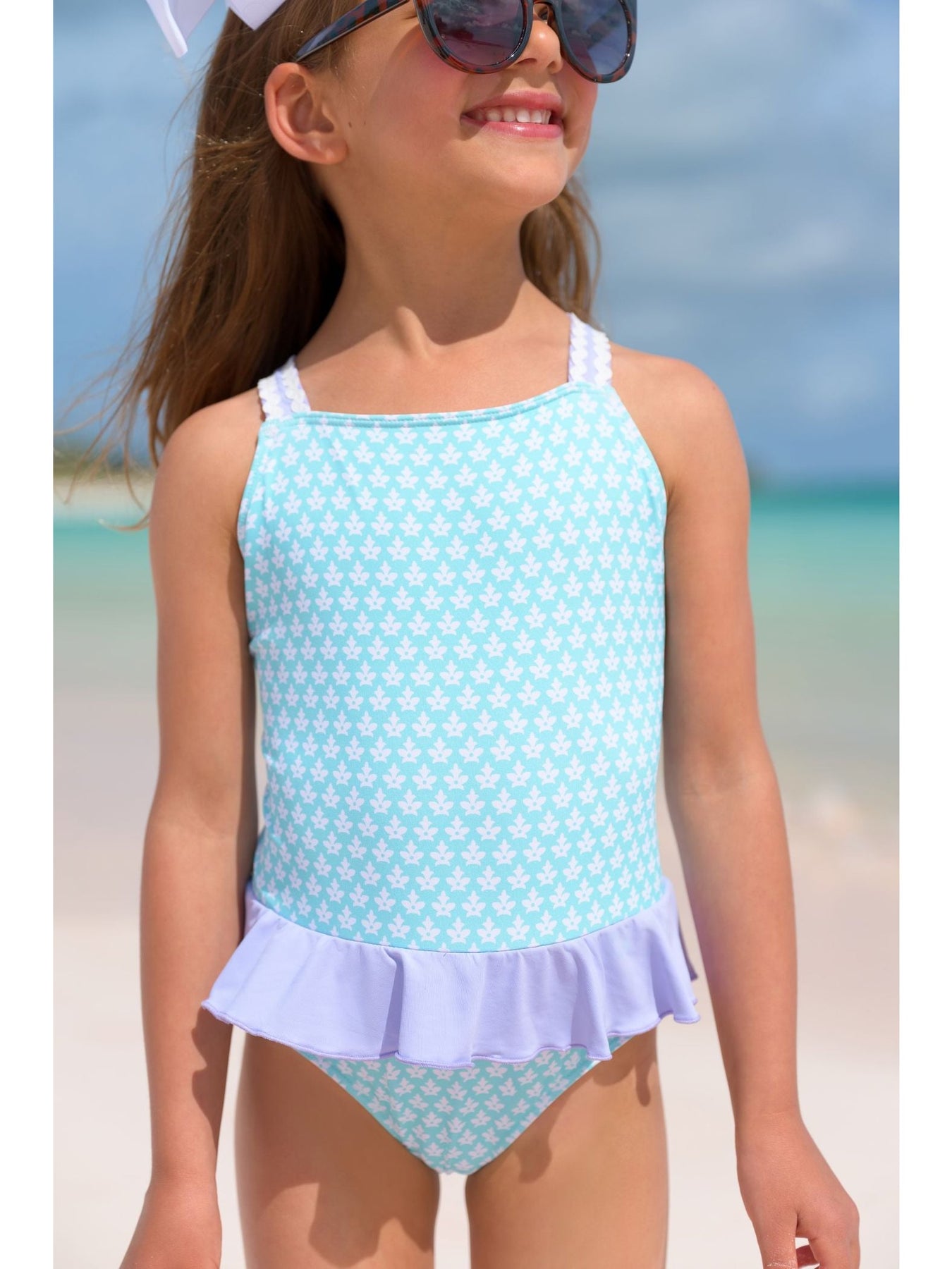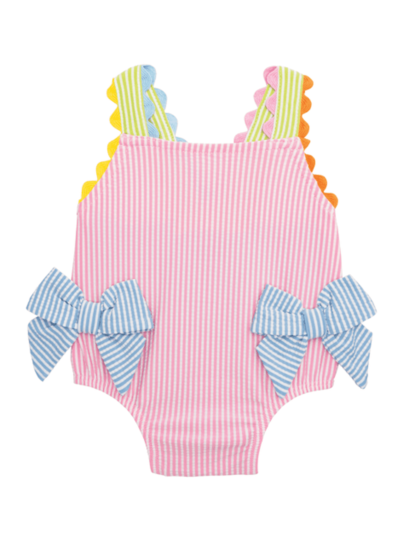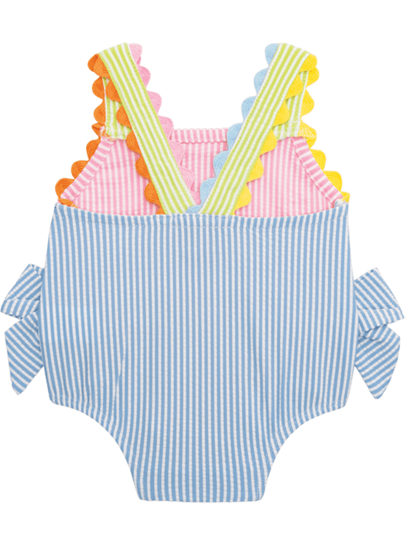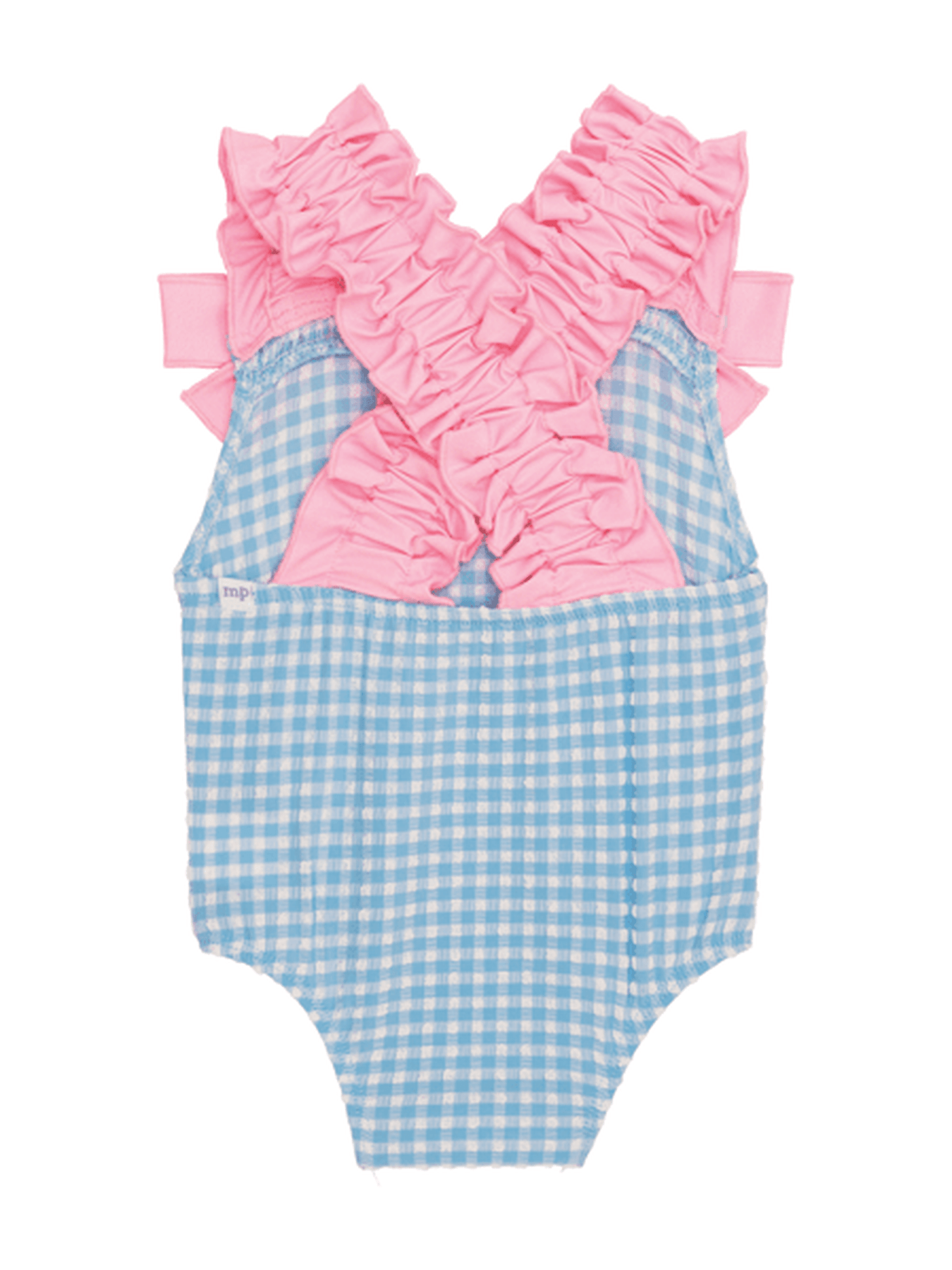 Let your little one bloom in style with the Americana Petal Playsuit- a sweet bubble crafted in a floral print. The blue check trim on the petal collar contrasts beautifully with the floral, and is repeated on large side bows. The breathable fabric keeps her cool while the playful botanical design brings joy to every outing. Stunning!