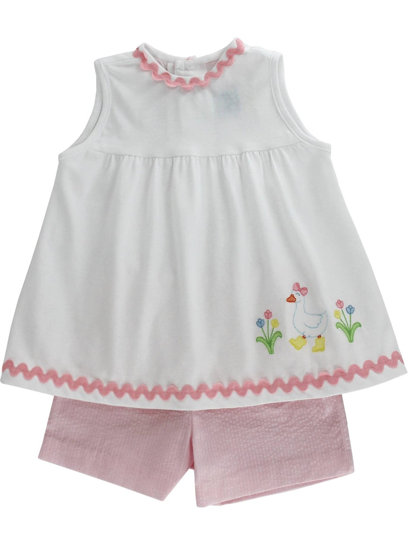 This sweet, classic John John brings a touch of charm to any occasion. Crafted in a soft fabric, it features a sleeveless design with buttoned straps for easy dressing. This John John is accented with a white chest panel, beautifully embroidered in a playful detailed design. Perfect for both playtime and special outings.