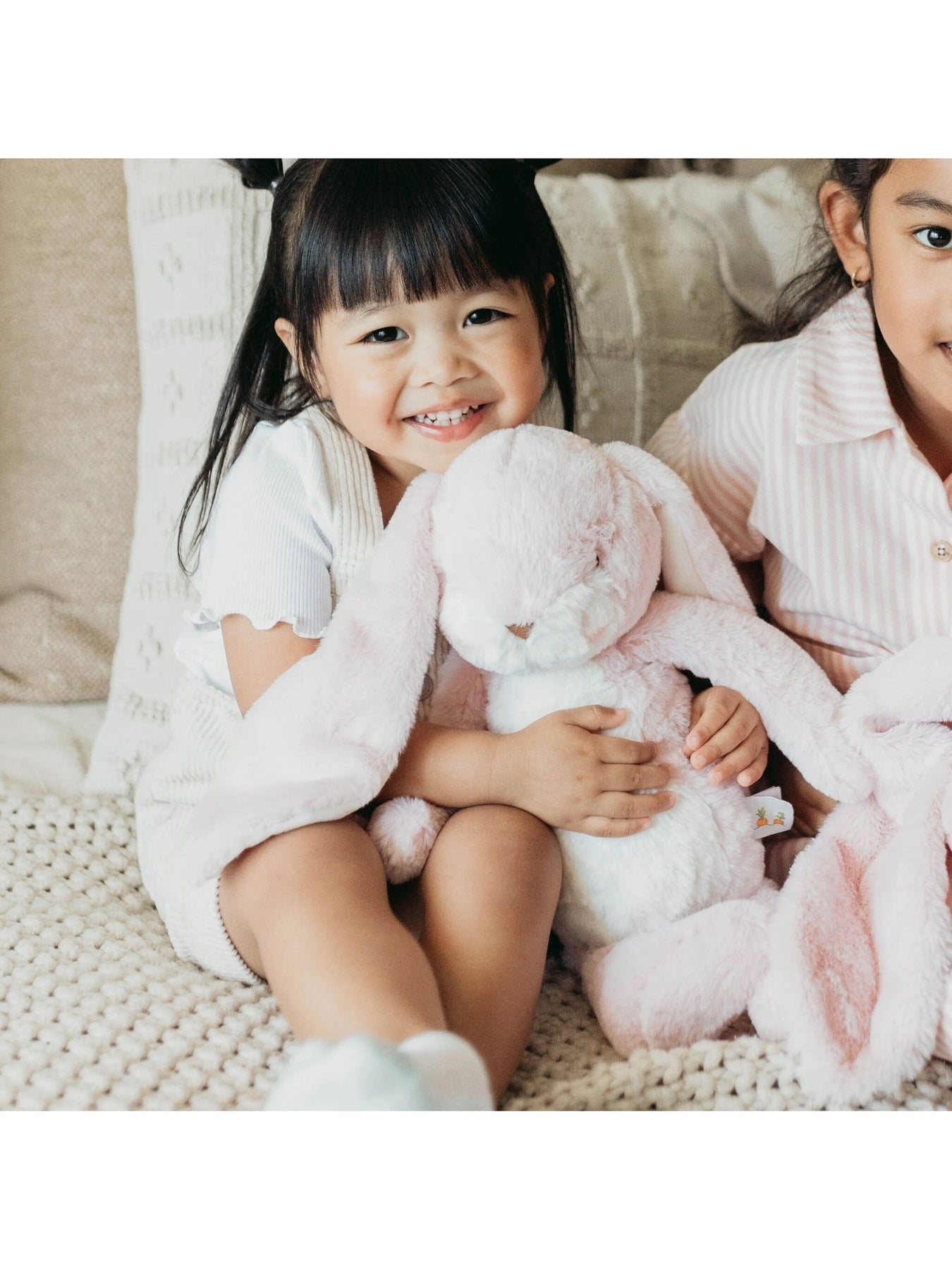 Regular price $26.95The Knotty Friend loveys have won the hearts of wee ones around the world. A sweet, fuzzy-faced bunny with baby-safe embroidered details, velour floppy body in soft pink, this knotty friend will not want to be out of your little one's hands. The knotted arms and legs are perfect for gentle chewing. Signature three carrot tag for little one's fingers. Add a monogram for an even better baby gift.