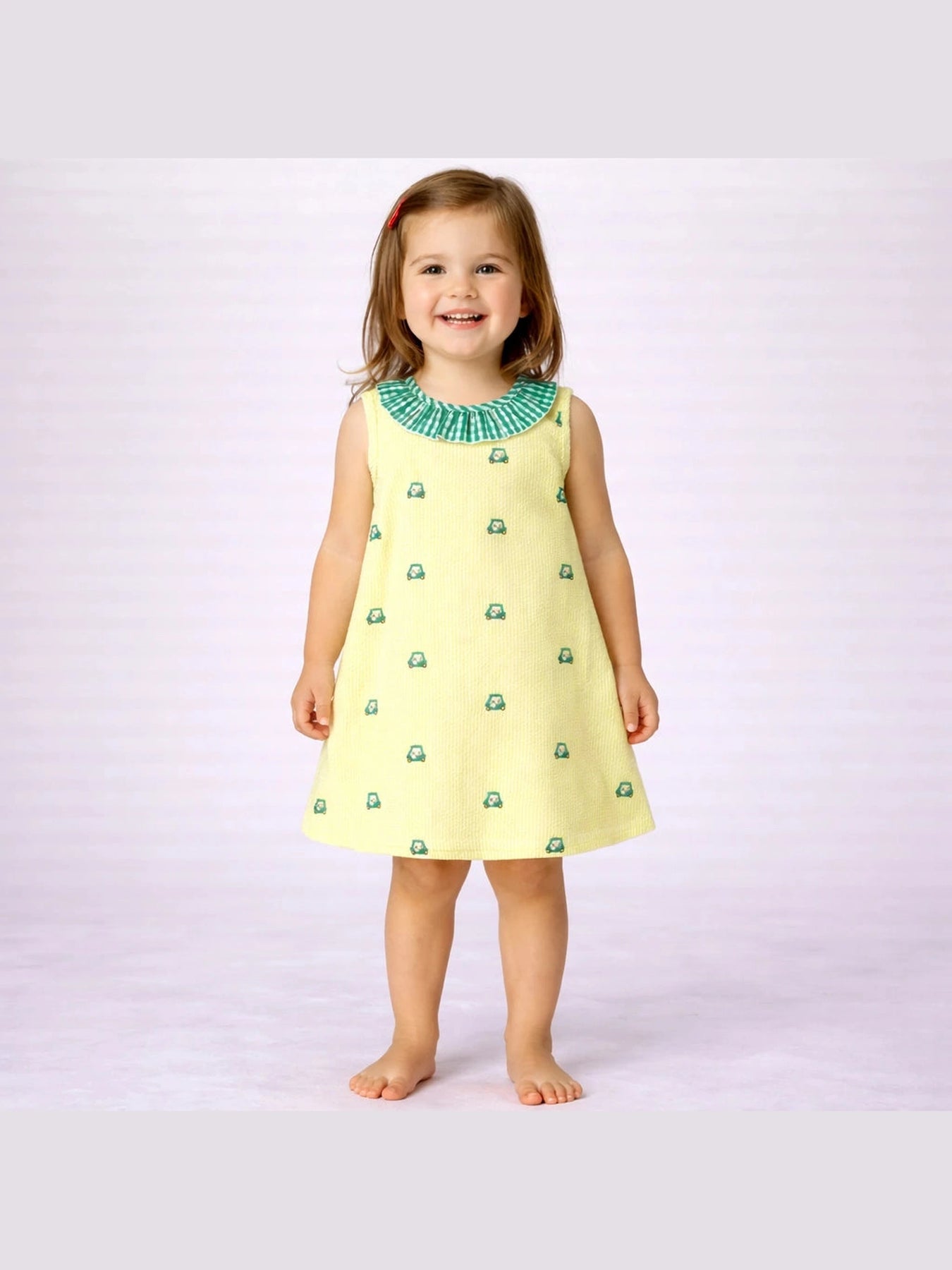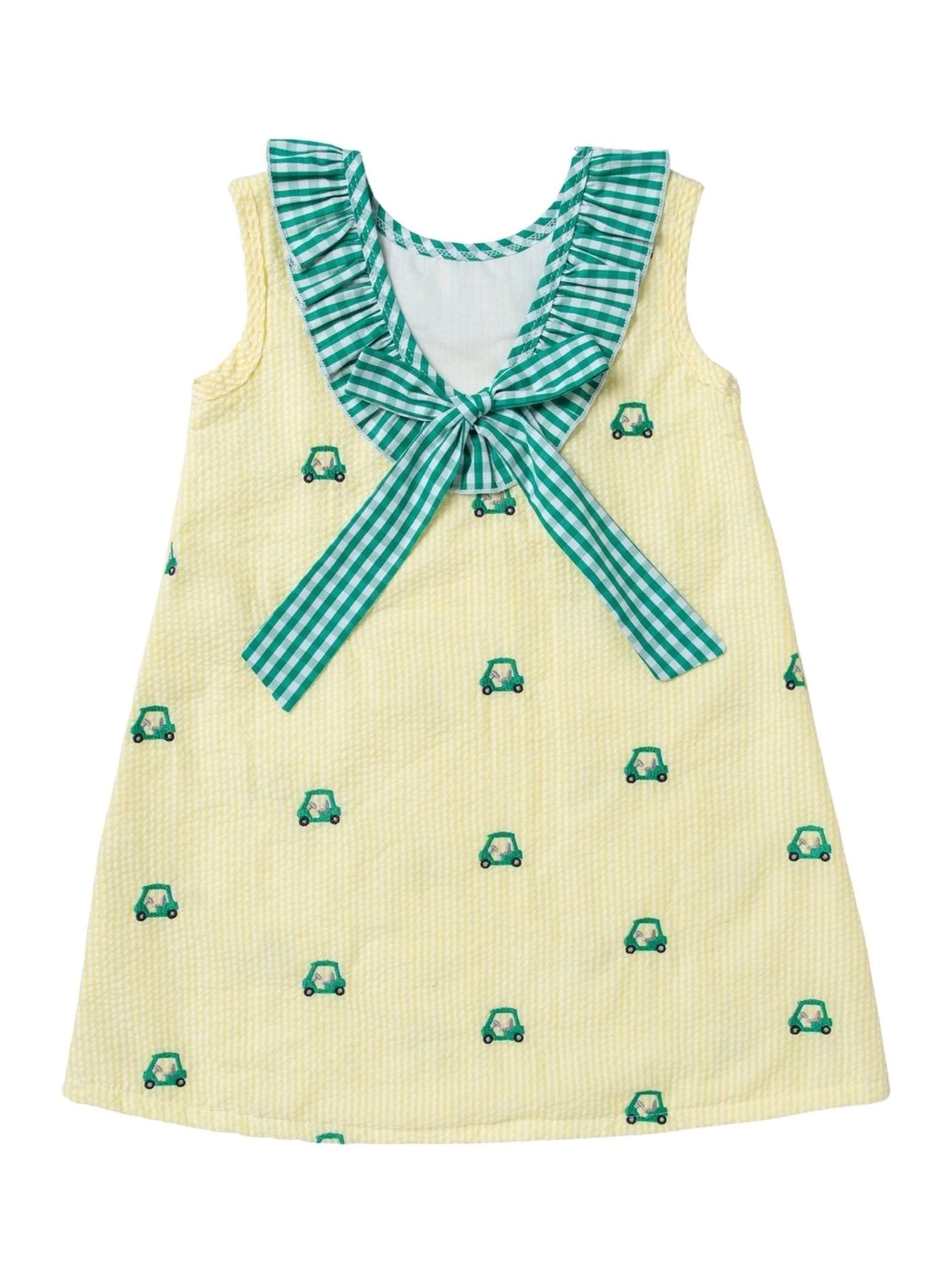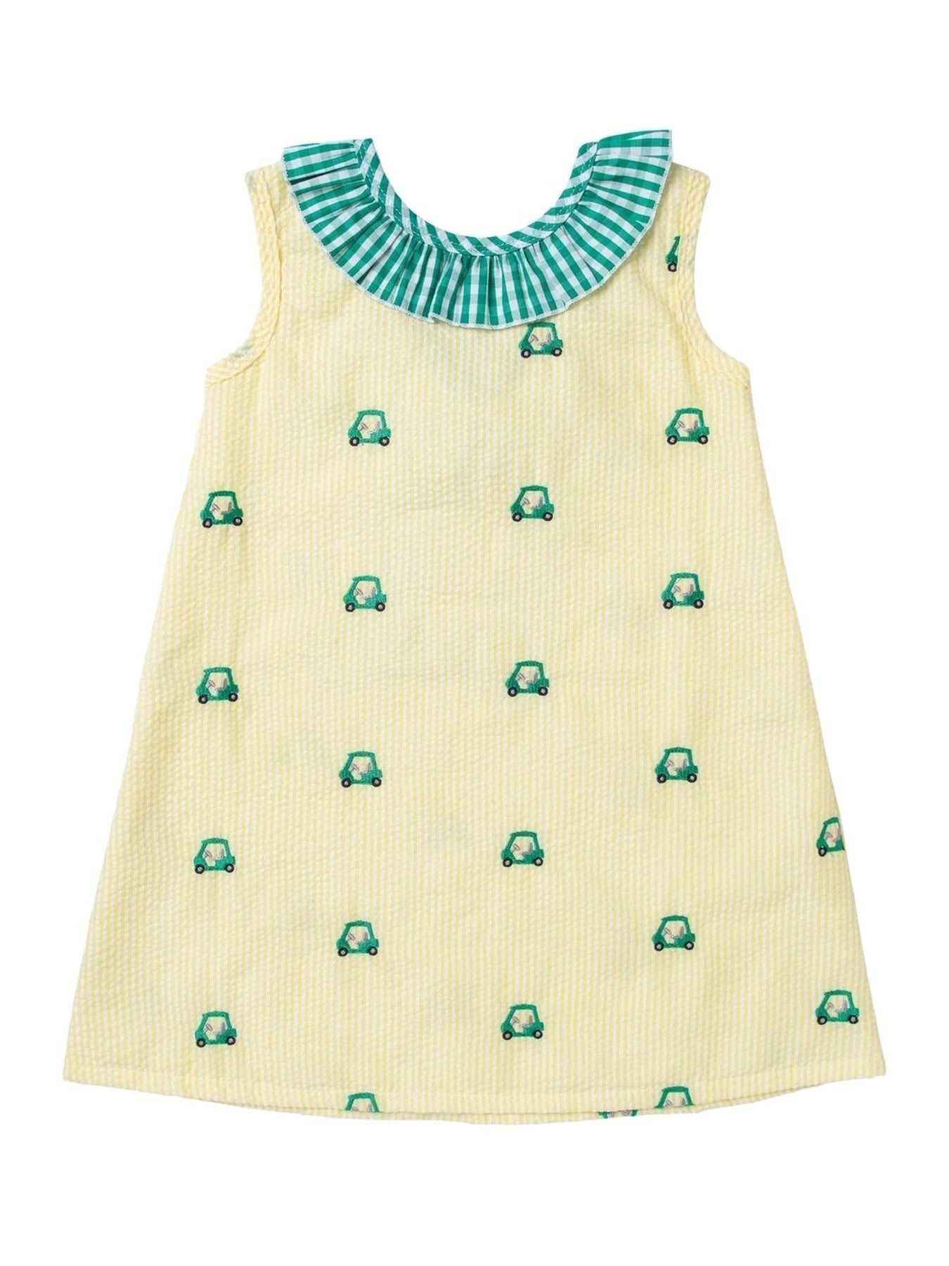Swing into style with this cheerful yellow gingham dress featuring charming green gingham trim and whimsical embroidered golf carts. Perfect for little ones who love the fairway—or just love standing out at any occasion. The classic gingham pattern pairs beautifully with delicate embroidery details that bring personality and movement to every wear. A timeless piece that's as fun to wear as it is to look at.