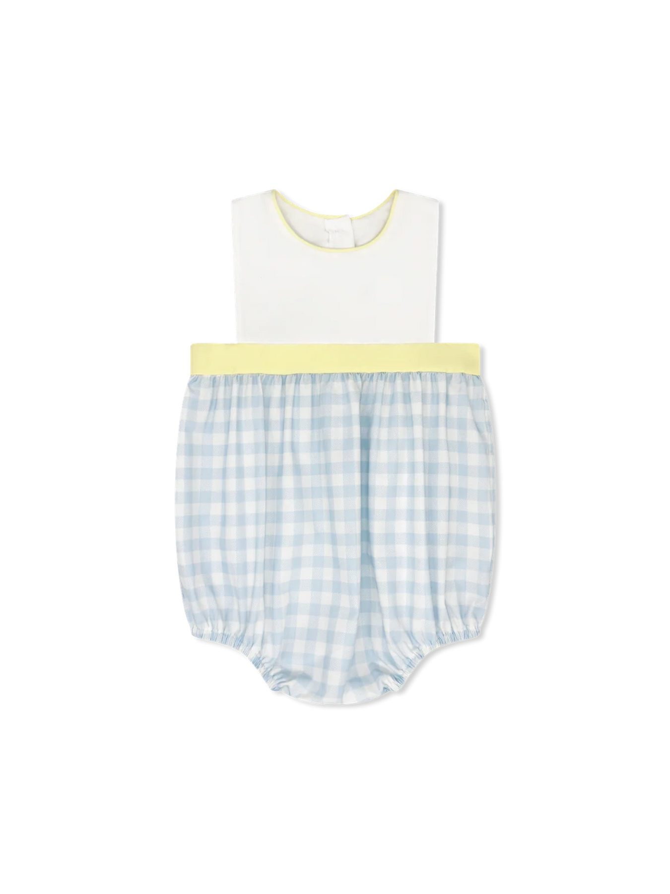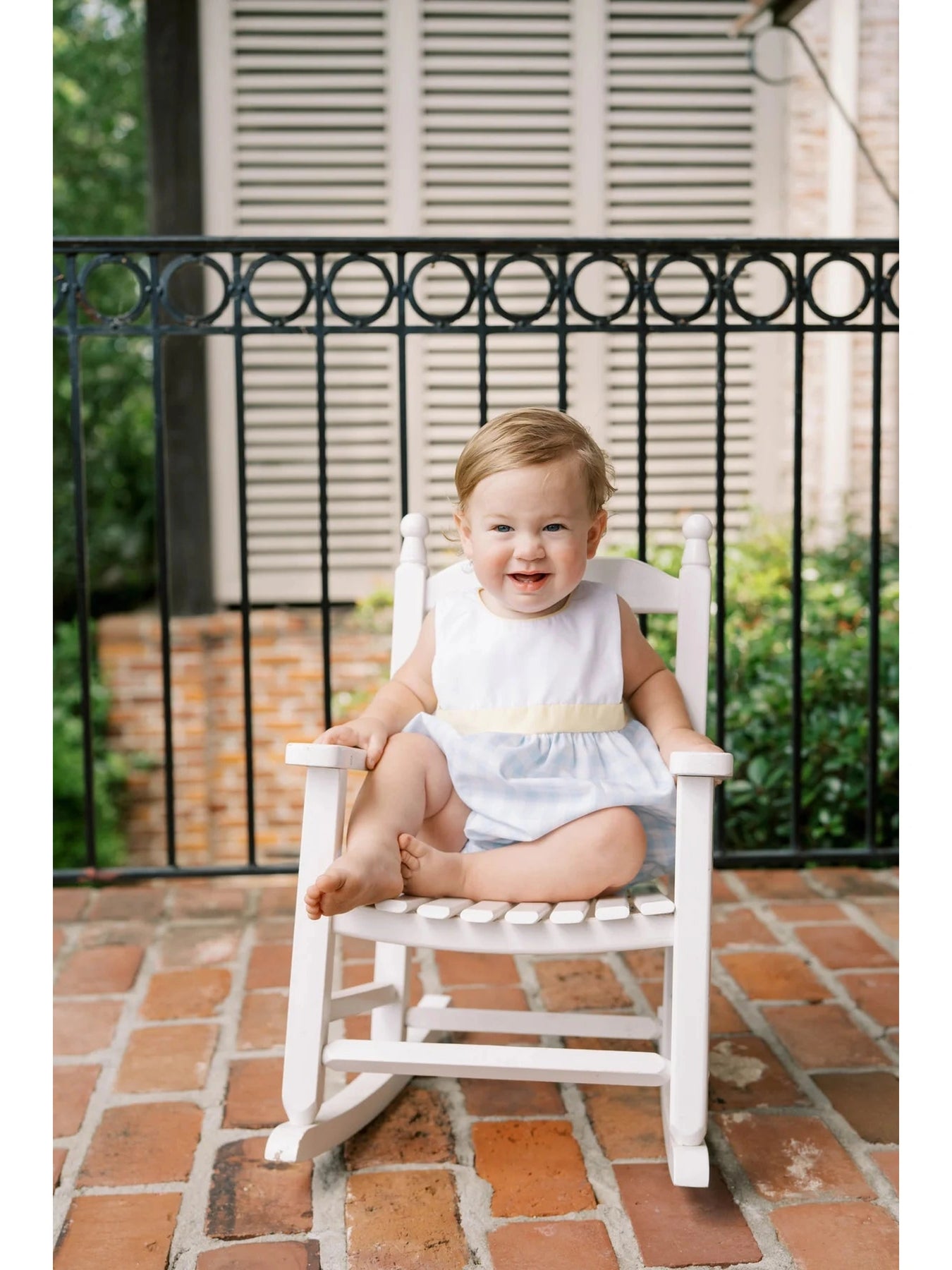 Featuring a crisp white top, this bubble is finished with a bold yellow band at the chest and coordinating yellow piping for a pop of color. The bottom is crafted in Baldwin Blue Buffalo Check, creating a fresh and timeless look perfect for sunny days, special outings, or everyday charm.