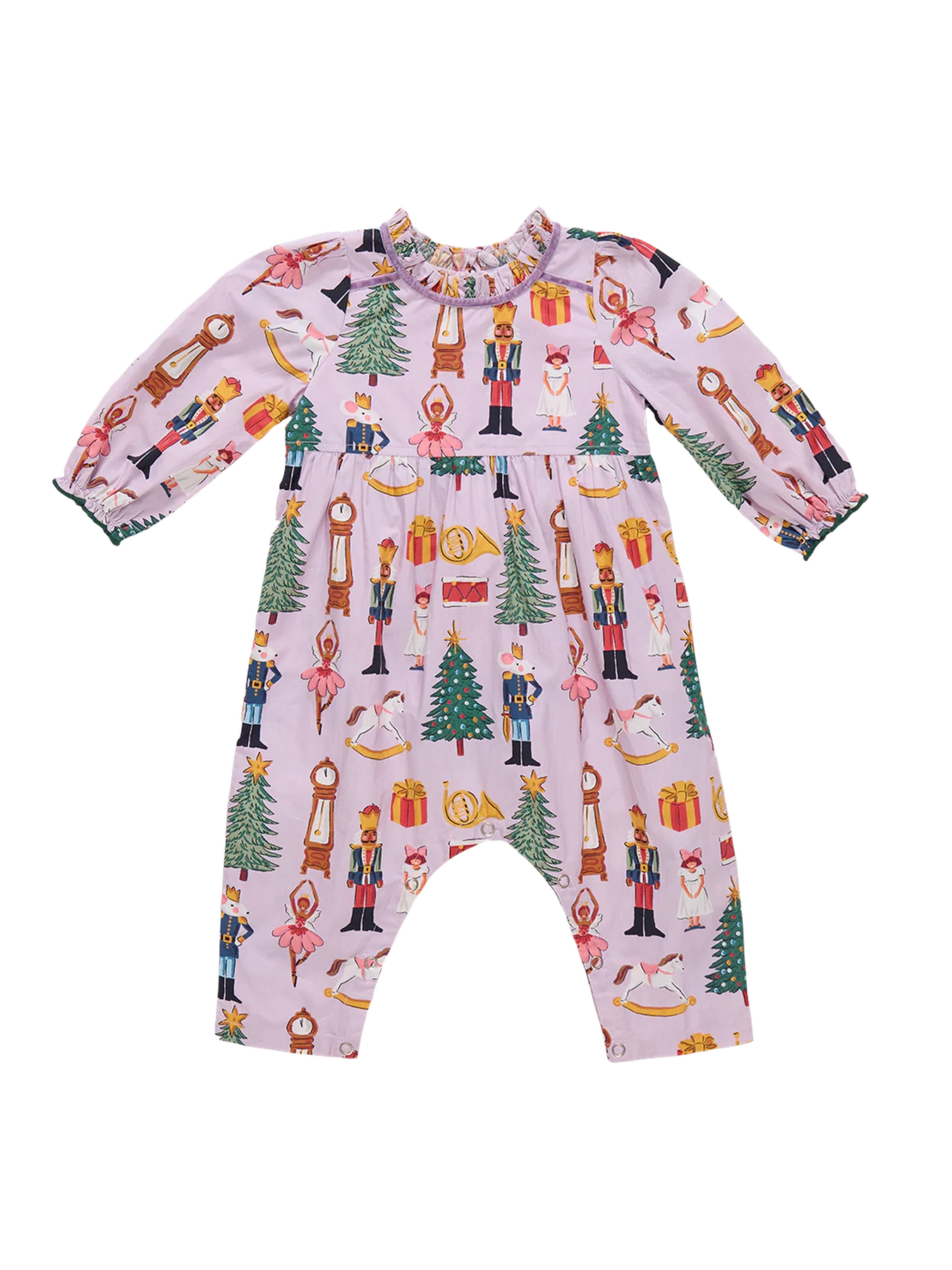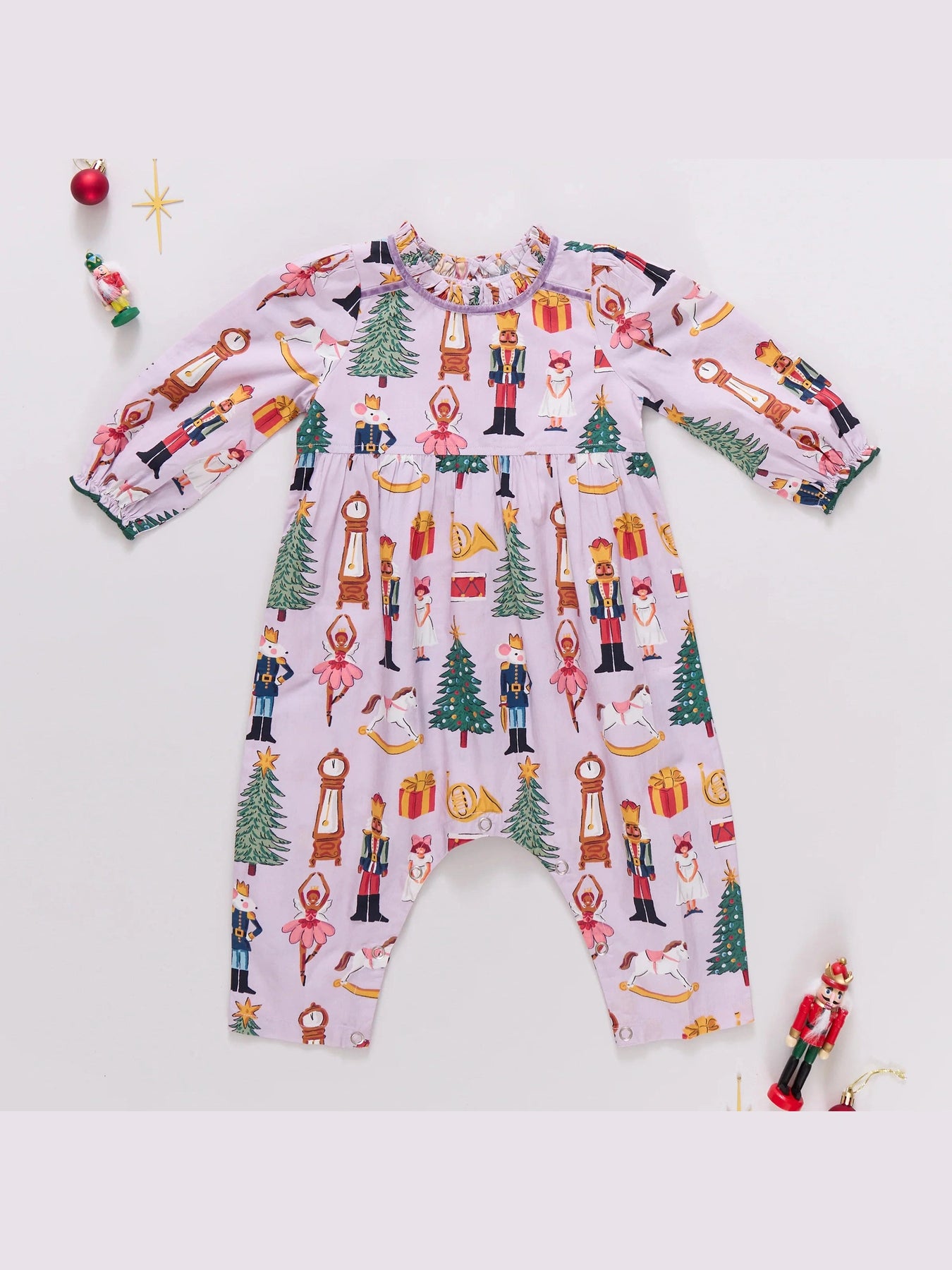 Regular price $104.00Sugarplum dreams! Your little ballet lover will be ready to pirouette, leap and take a bow alongside everything she loves about the Nutcracker in our Baby Girls Charlie Jumper in Lavender Nutcracker. This long sleeve one-piece features lavender velvet taping at the shoulders and neck and a tiny green pearl stitched ruffle at the neckline and wrist. Invisible zipper at the back. Match back to Big Sis in our Girls Peachy Dress.