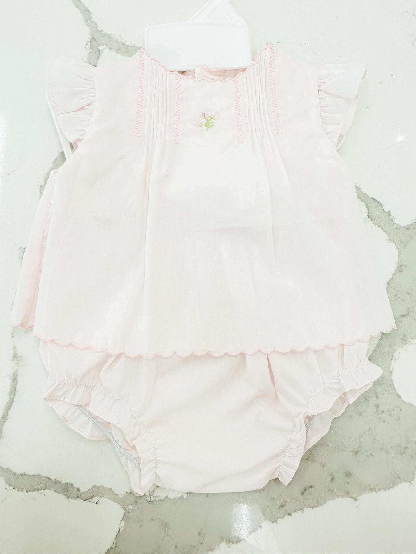 This exclusive Sally Floral Embroidered Diaper Set delights in sophisticated style. Crafted of soft pink, the sleeveless set features scalloped trim and chic floral embroidery that will make your little one look extra special. An elegant choice for special occasions.