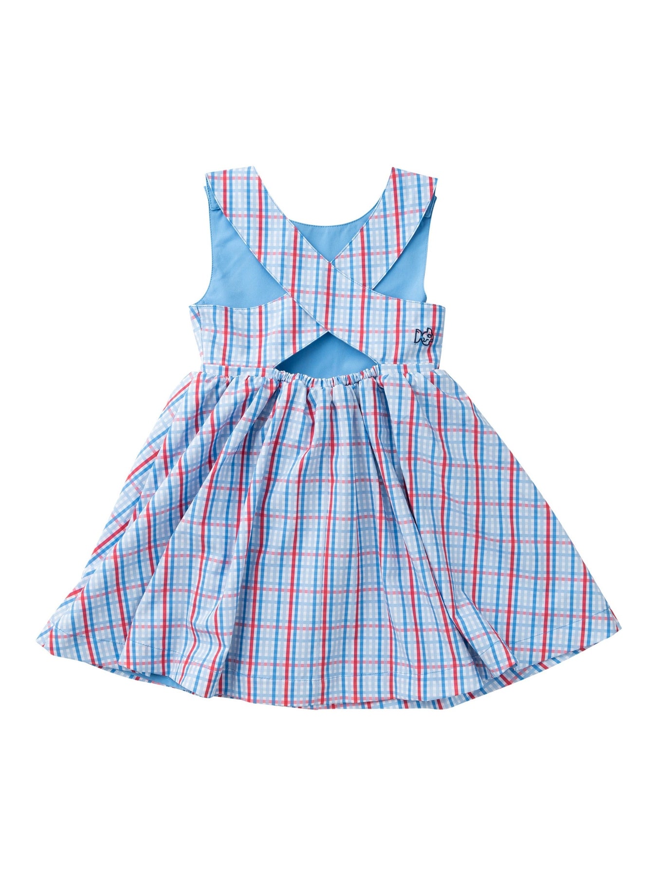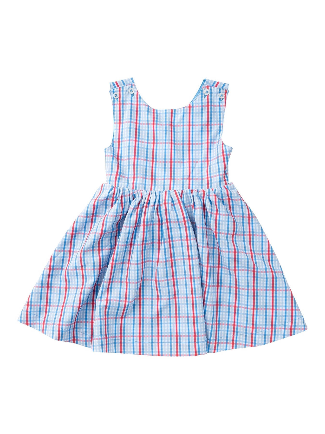 Twirl into patriotic style with this charming plaid circle dress! Featuring a vibrant red, white, and blue plaid pattern, it boasts a full, twirly skirt perfect for spinning and playing. The simple bodice pairs beautifully with a fun crisscross back detail, while a solid blue lining keeps things comfy underneath. Whether you're celebrating the Fourth of July or just enjoying a summer backyard bash, this dress is ready for adventure!