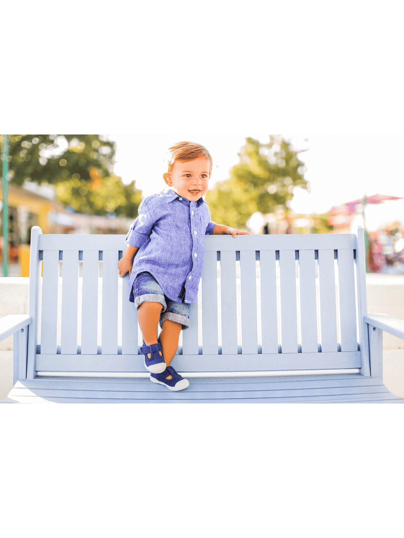 Canvas T-strap sneakers with Velcro closure. Rubber soles. Machine washable. Variety of colors.