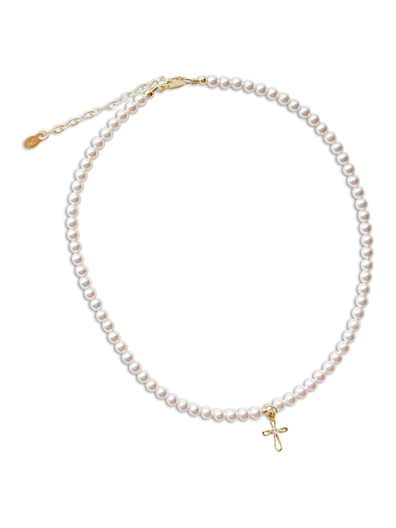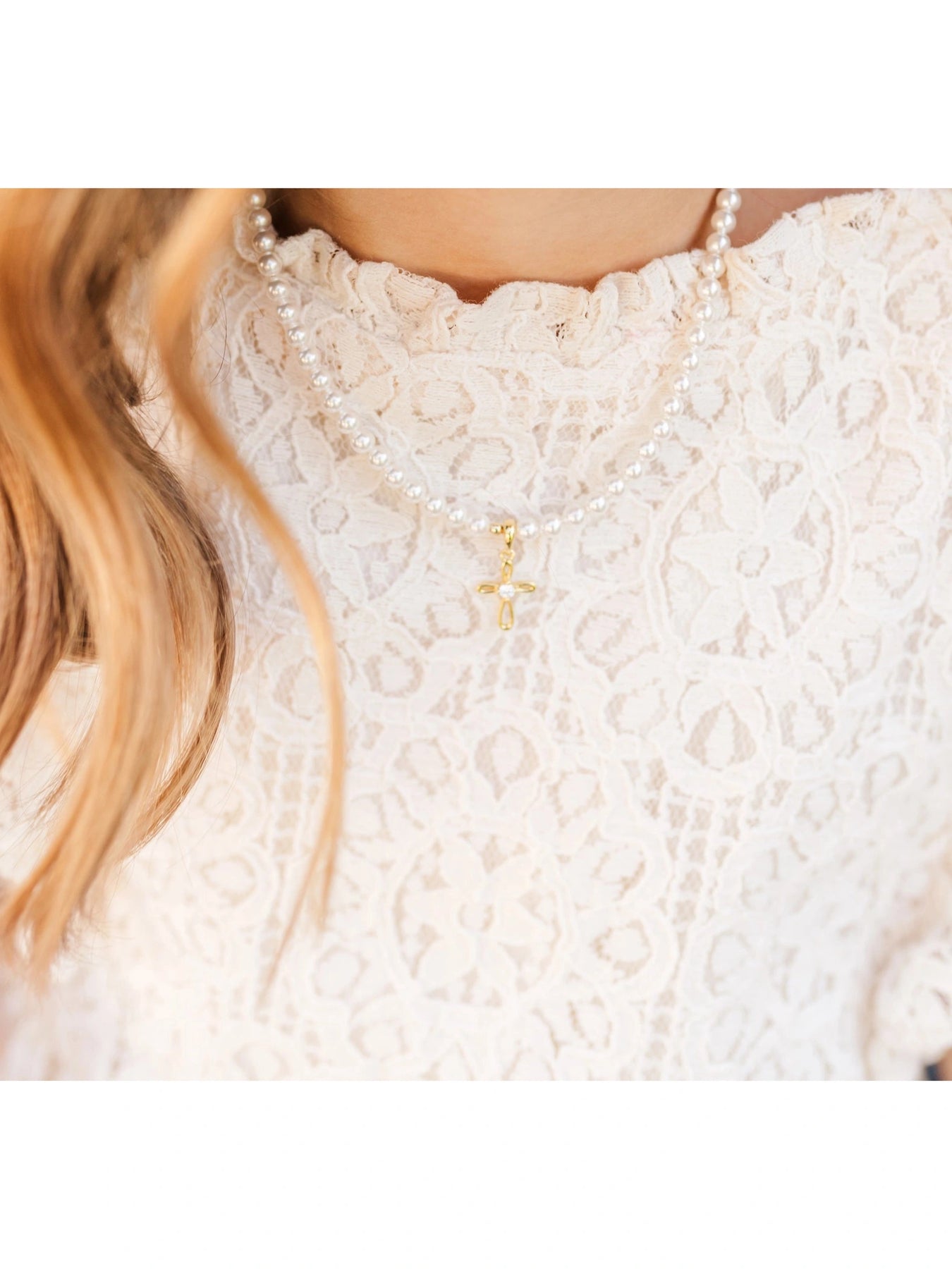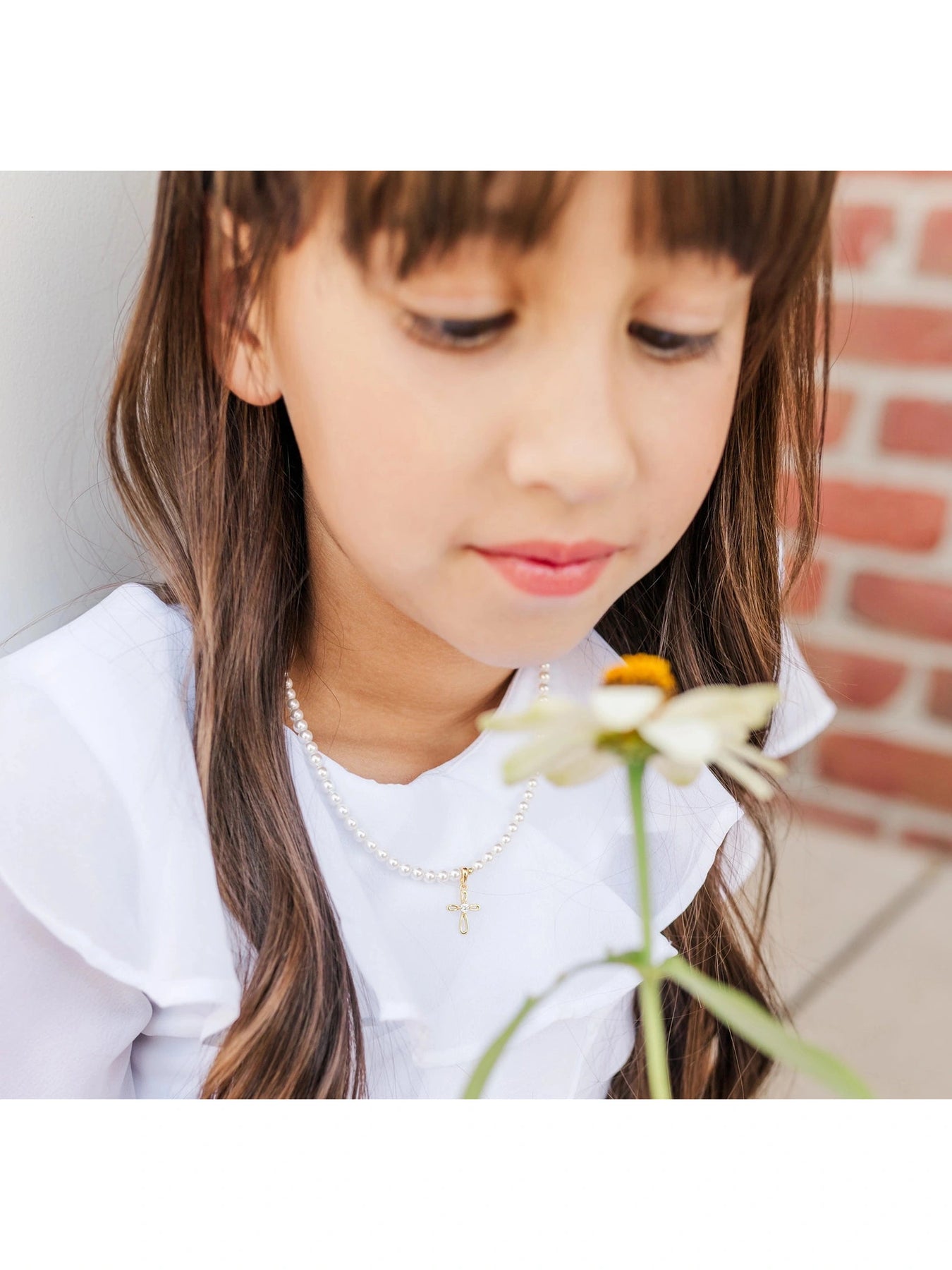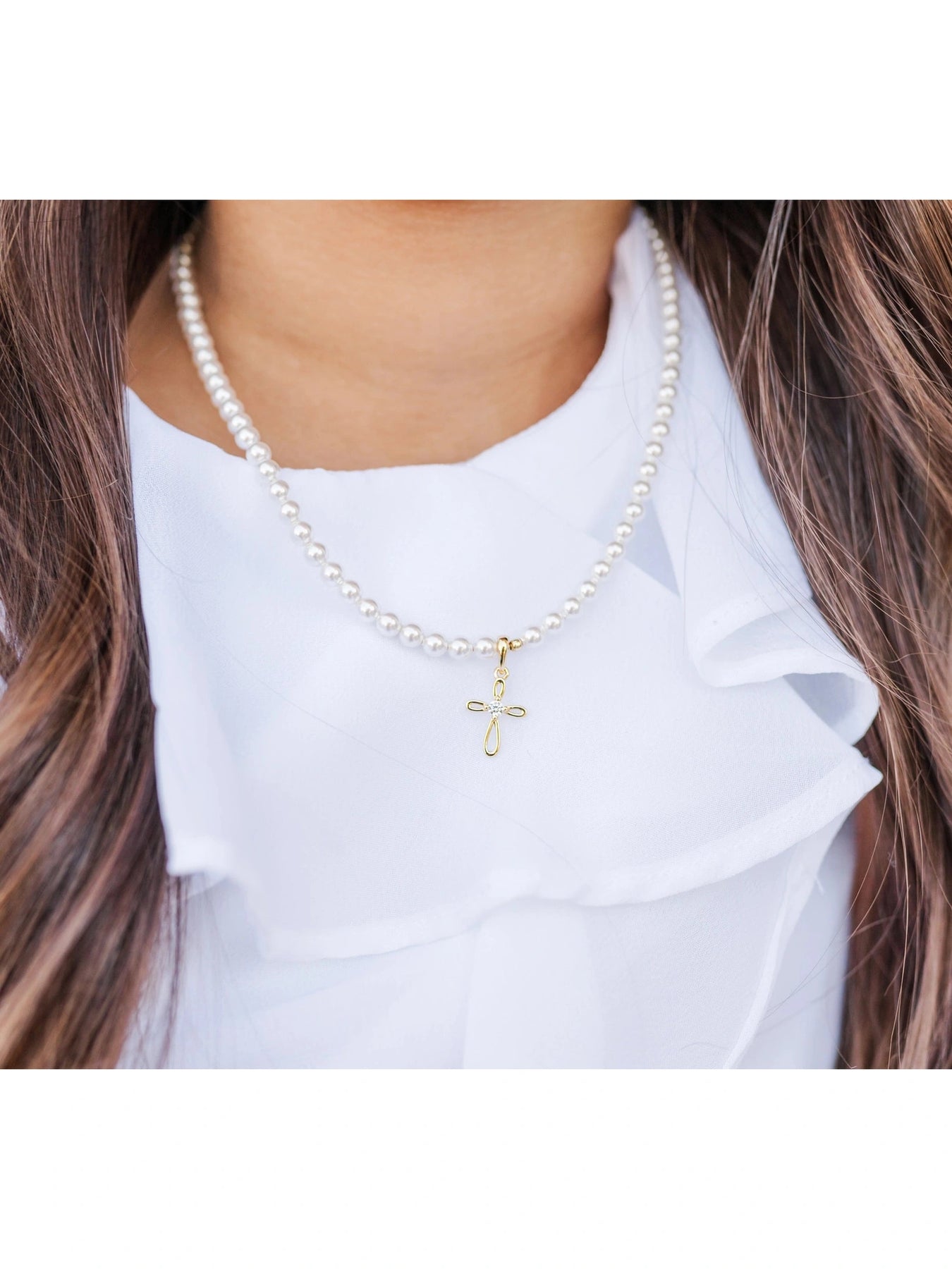 Regular price $43.00This keepsake necklace is made with high-end Austrian simulated pearls and 14K gold-plated beads accented with a beautiful dainty cross charm with sparkling CZs! This high-quality necklace is sterling silver and then plated with 14K gold plating. This makes a very special gift for baby baptism, infant christening, girls first communion, or other religious gift. A gorgeous classic she will cherish forever! Necklace comes in a beautiful black/pink gift box ready for gifting. Necklace measures 12" + 2" extension chain so it's adjustable for a perfect fit.