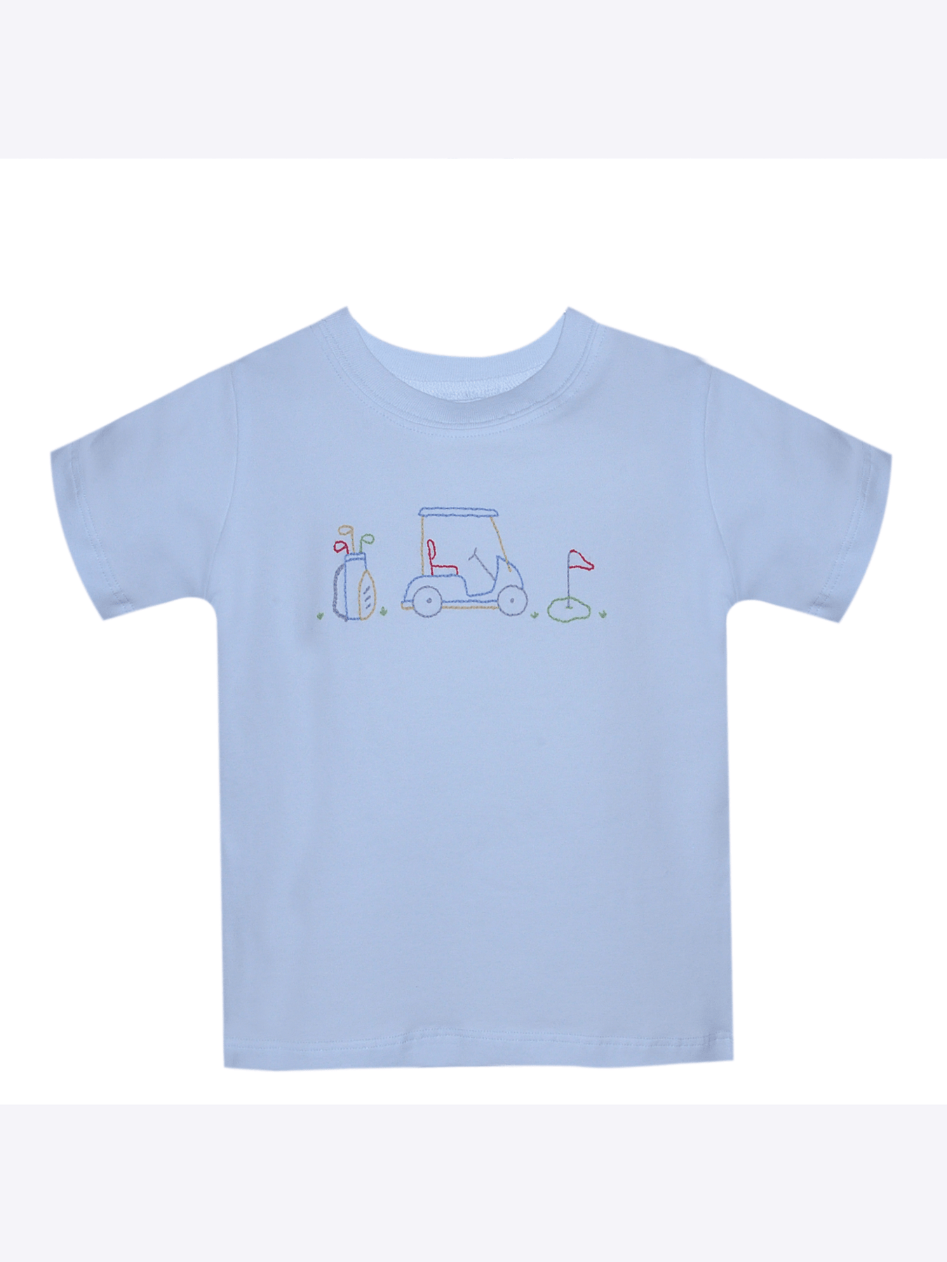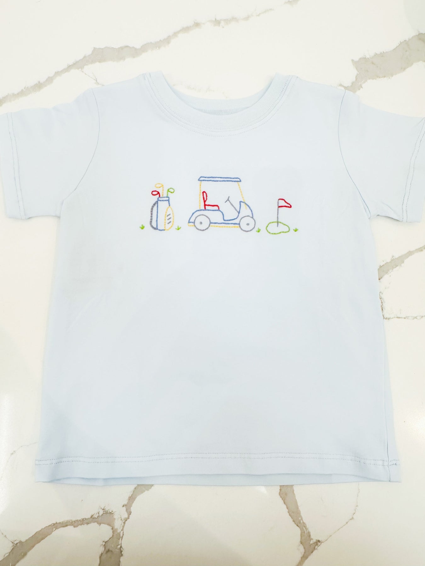This light blue knit short sleeve top features an embroidered golf scene across chest. Pair with shorts or jeans for a top your little man will be excited to wear!