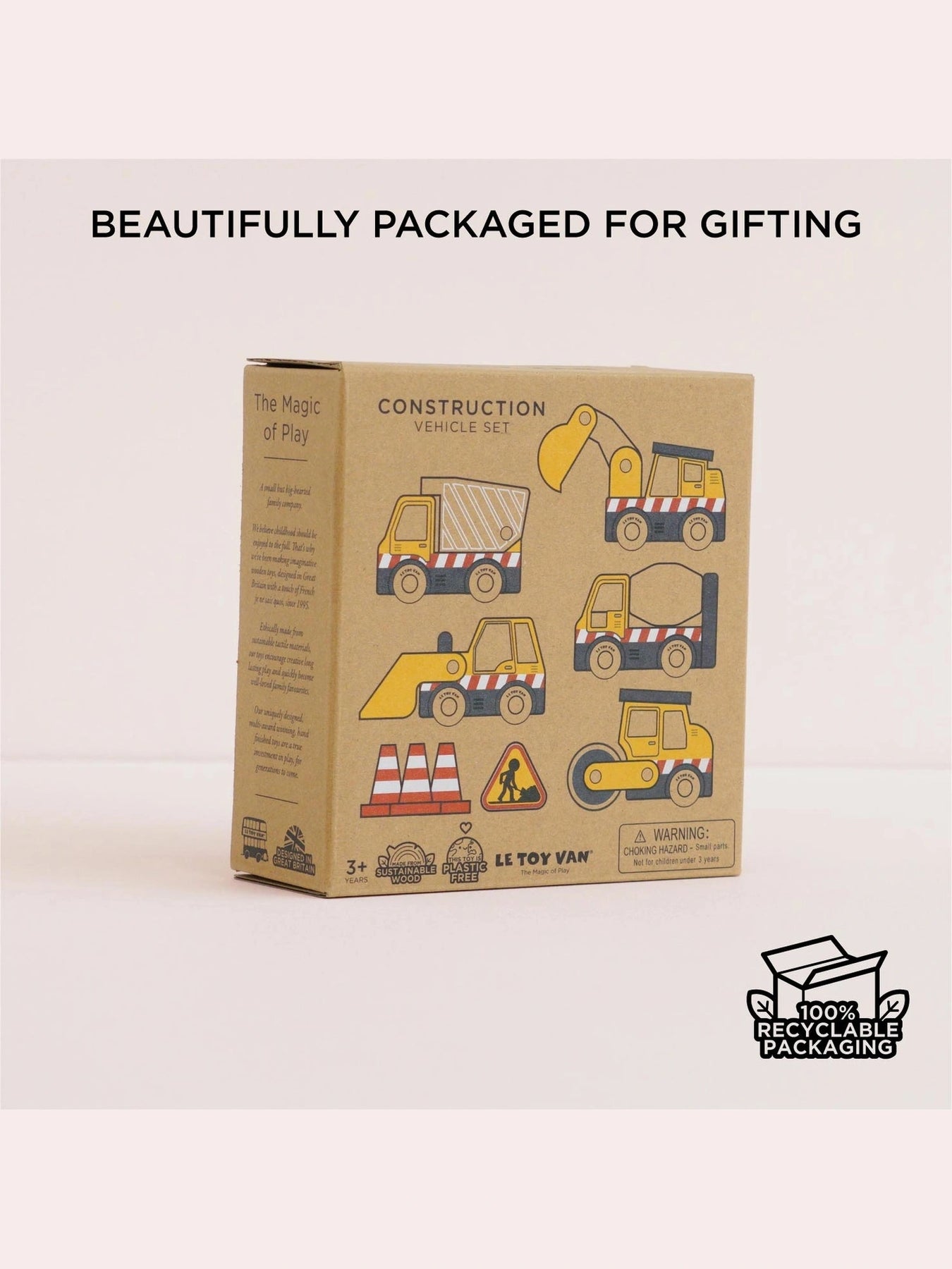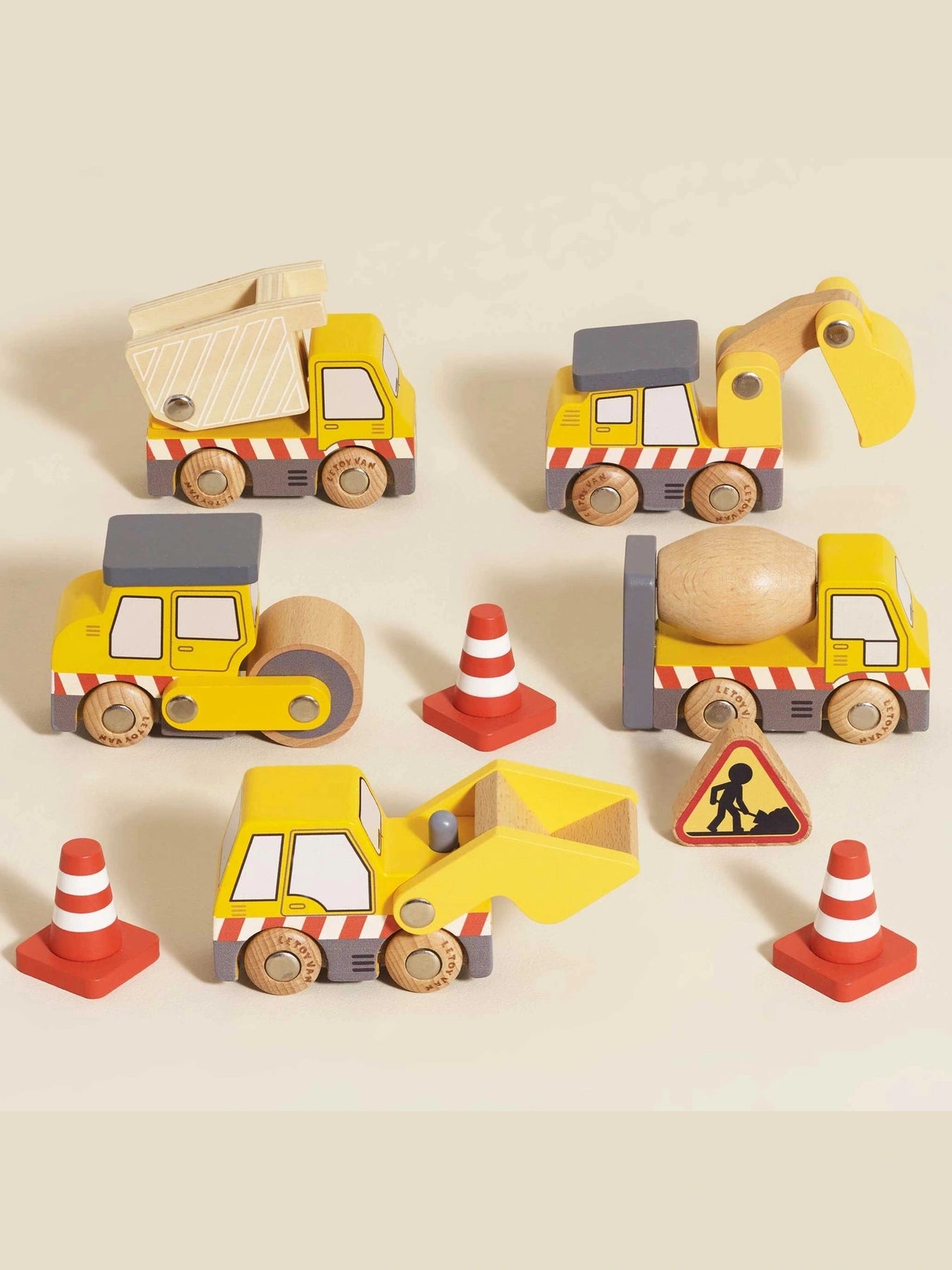 Regular price $39.95Budding builders are sure to love our best-selling construction set. Take imaginations off to new adventures with this 9-piece toy which includes a digger, cement mixer, dump truck, roller, front loader, cones and road works sign. Each vehicle features a moving part for realistic play possibilities. Great for developing social skills and encouraging imaginative and interactive play. Compatible with our standard train tracks and garages. -Safety tested for ages 2 years+ -Made of FSC®-certified wood -Plastic-free toy -Decorated with non-toxic, water-based resistant paints