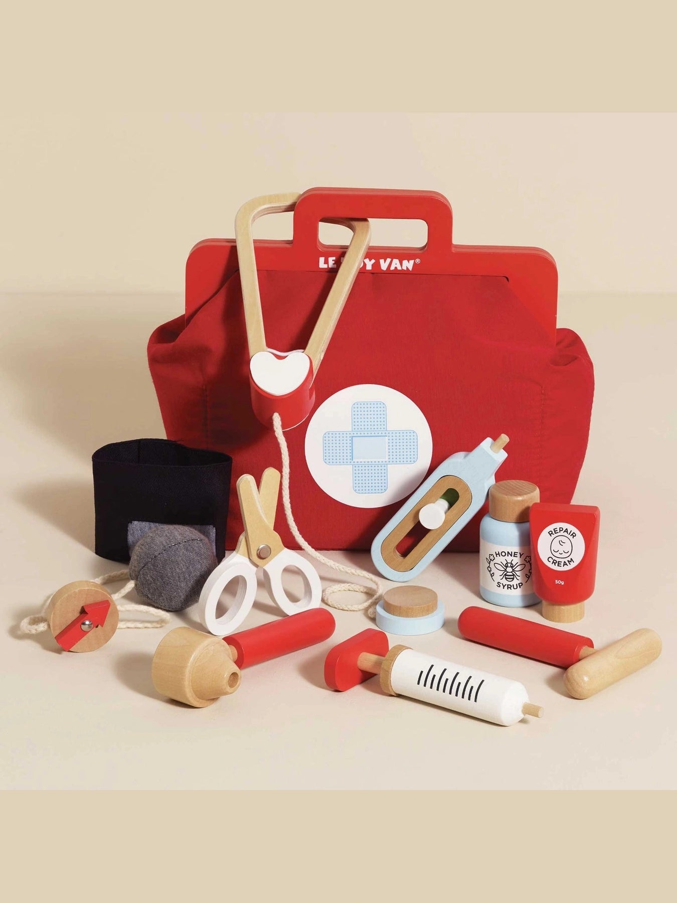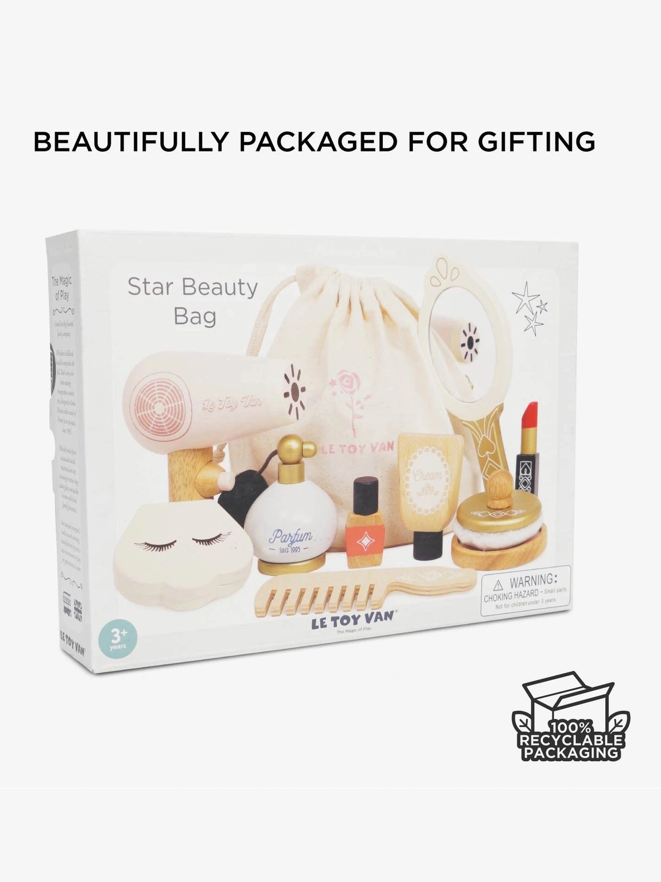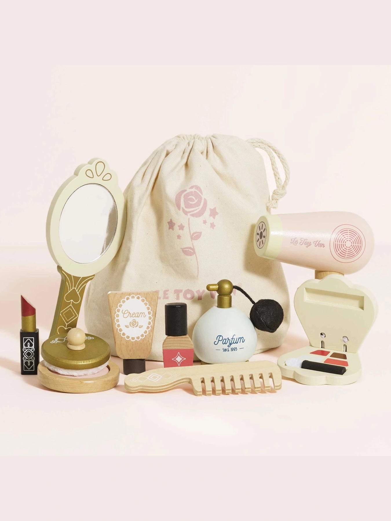 Regular price $69.95Be the star of your own show! Budding beauticians will love this beauty bag. This sweet 11-piece toy consists of a host of chunky wooden make-up pieces with smooth, child-safe edges, all hand-painted in appealing designs. Elements include a vintage perfume bottle with a bulb atomiser, a hand held mirror, a hair dryer, a comb, a shell compact make up kit, a lotion, a nail varnish, a lipstick and a powder puff. Mini make up artists will soon set to work. Also included is a fabric cosmetics bag made from natural cotton, allowing for portable fun - perfect for imaginative role-play adventures. -Suitable for ages 3 years+ -Made of FSC®-certified wood -Decorated with non-toxic, water-based resistant paints