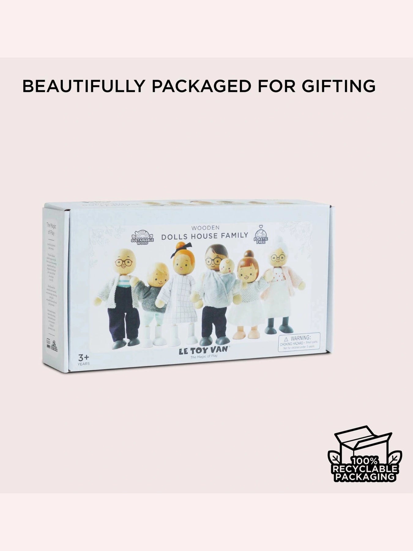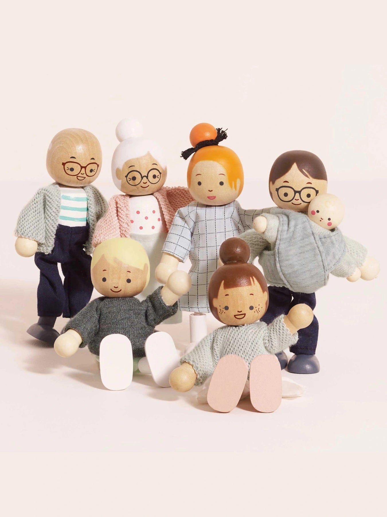 Regular price $39.95This lovely little doll family are ready to move into their brand-new dream home. Comprising 7 highly detailed, posable dolls, this set is made up of parents, grandparents, 2 children and a baby, complete with a baby carrier. Dressed in beautiful, hand-finished outfits, this family are ready to be welcomed to the neighborhood. An ideal toy to educate and inspire, helping to encourage social play and refine fine motor skills for a lifetime of learning. Compatible with all of our dolls, dolls houses and accessories. -Suitable for ages 3 years+ -Made of FSC®-certified wood -Plastic-free toy -Decorated with non-toxic, water-based resistant paints