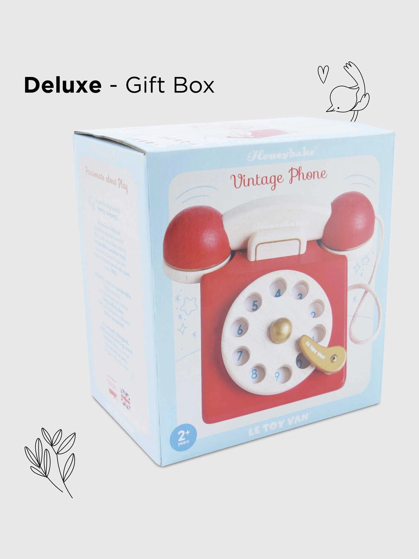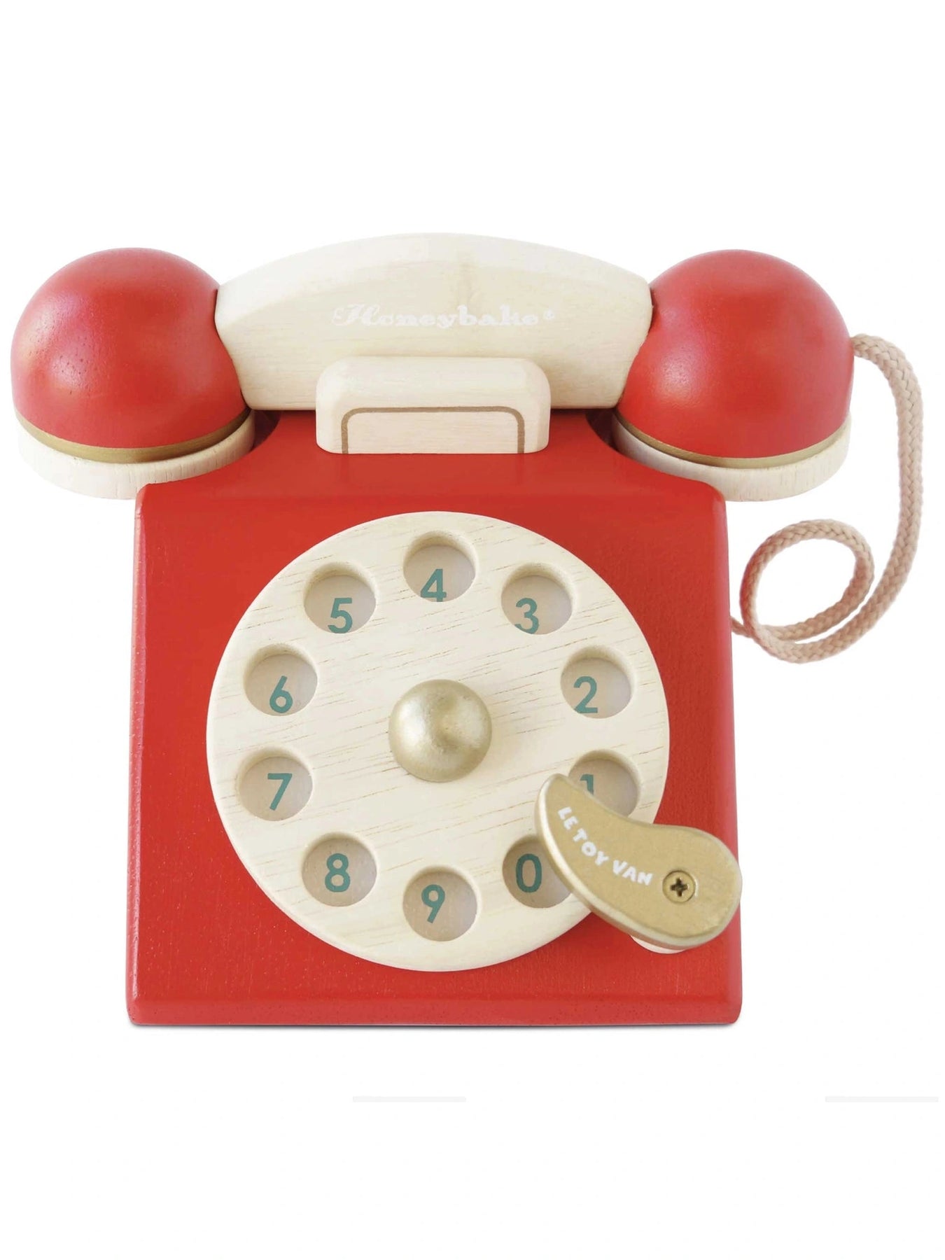 Regular price $39.95Ring, ring! This charming retro-style vintage phone is full of nostalgia, for good old-fashioned playtime fun! Painted in a striking red shade and finished with a flourish of gold accents for a touch of luxury, this toy features a ringing bell within the handset for realistic role play scenarios. The digits and spinning wheel are designed to encourage number recognition as well as aiding in numeracy and counting skills. -Suitable for ages 2 years+ -Crafted from solid, sustainable rubberwood -Plastic-free toy -Decorated with non-toxic, water-based resistant paints