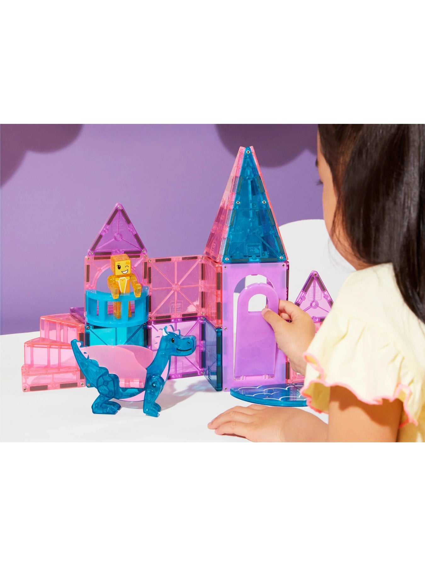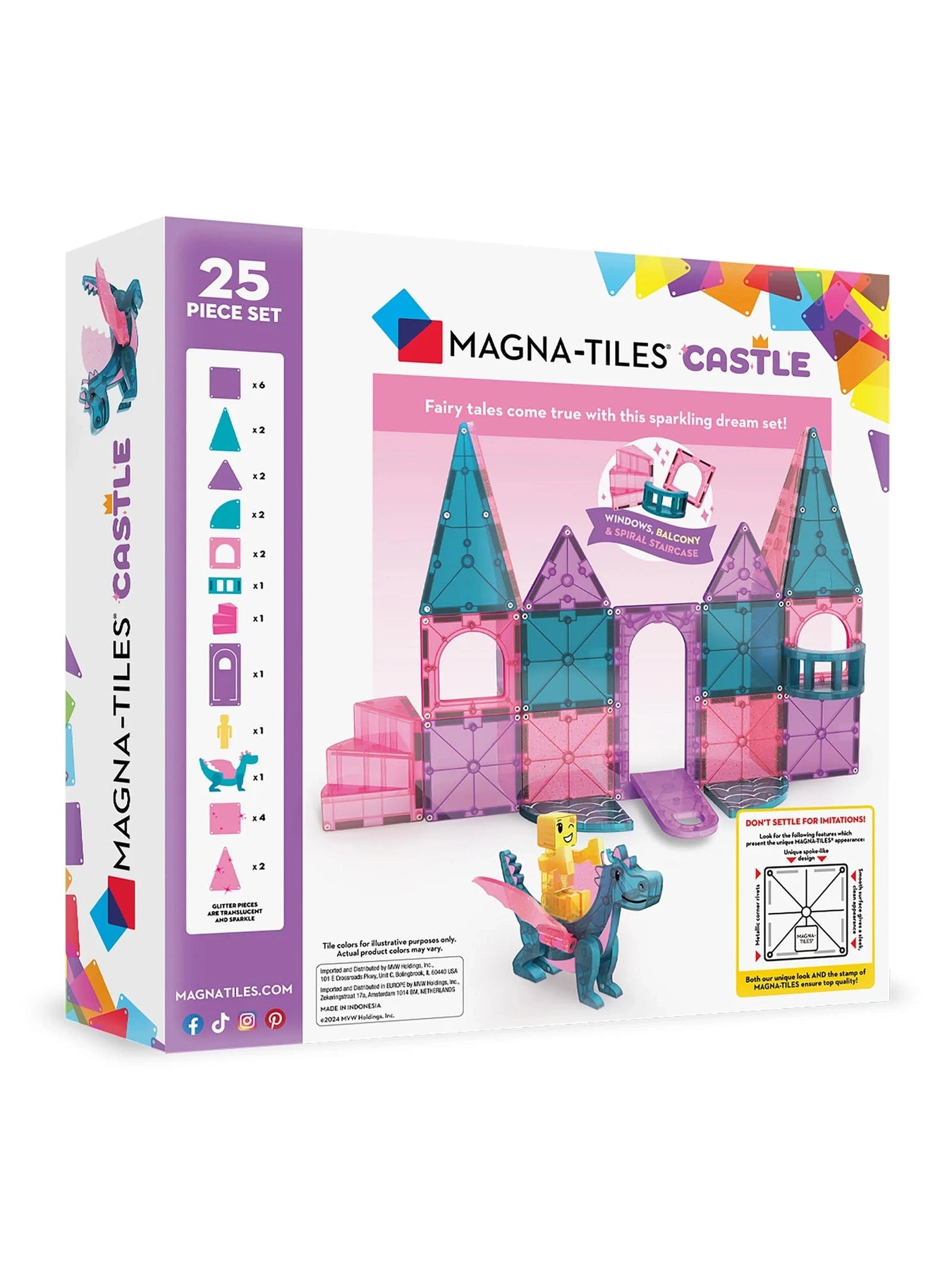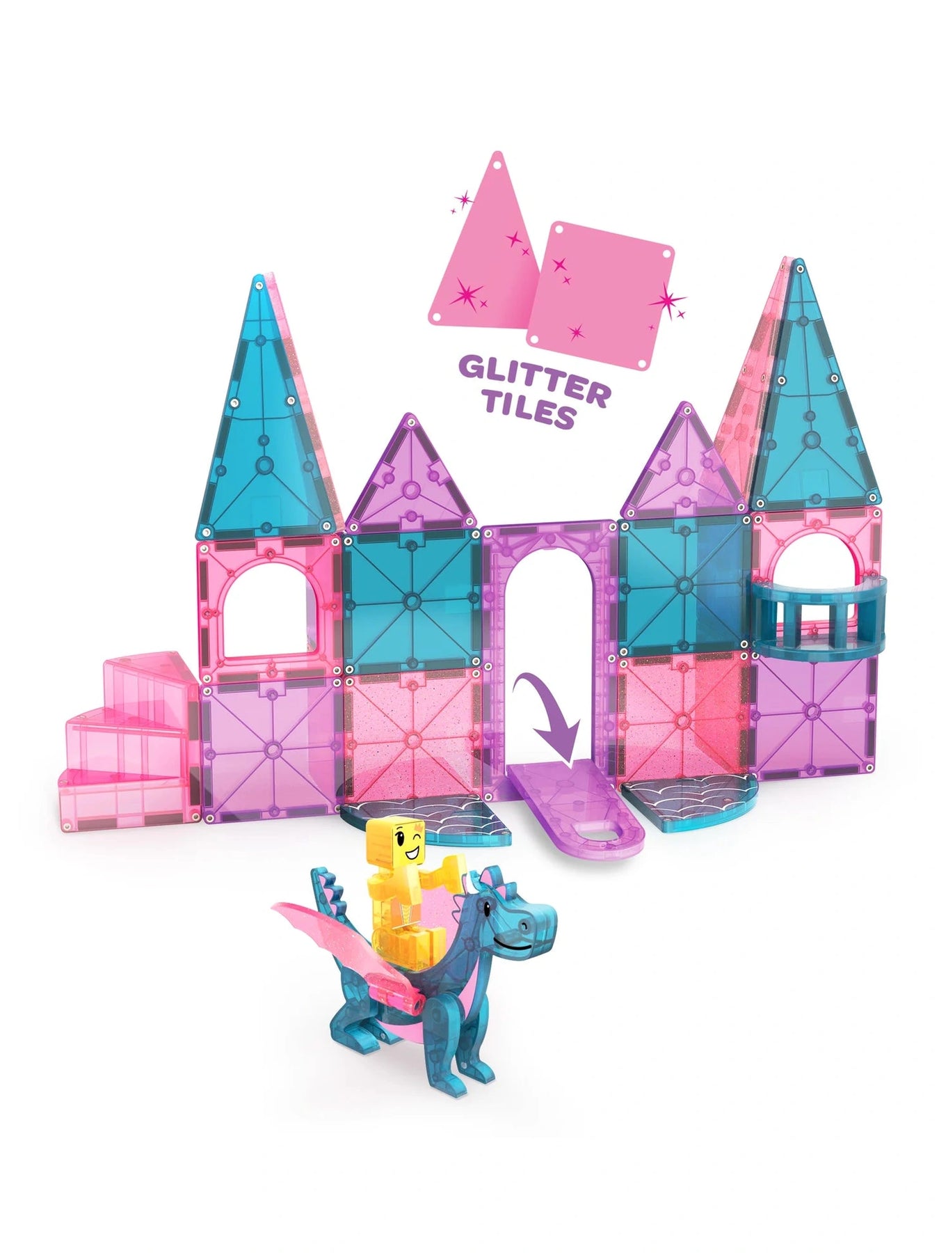 Step into a magical world with the Magna-Tiles Castle 25pc. Set! Open the working drawbridge to explore your kingdom, climb the spiral staircase, and enjoy the first-ever balcony feature. Spark imagination with the exclusive Dragon Figure and shimmering glitter tiles that add a touch of enchantment. Perfect for endless creative play, this set invites little builders to craft their own fairy tale adventures full of fun and wonder.