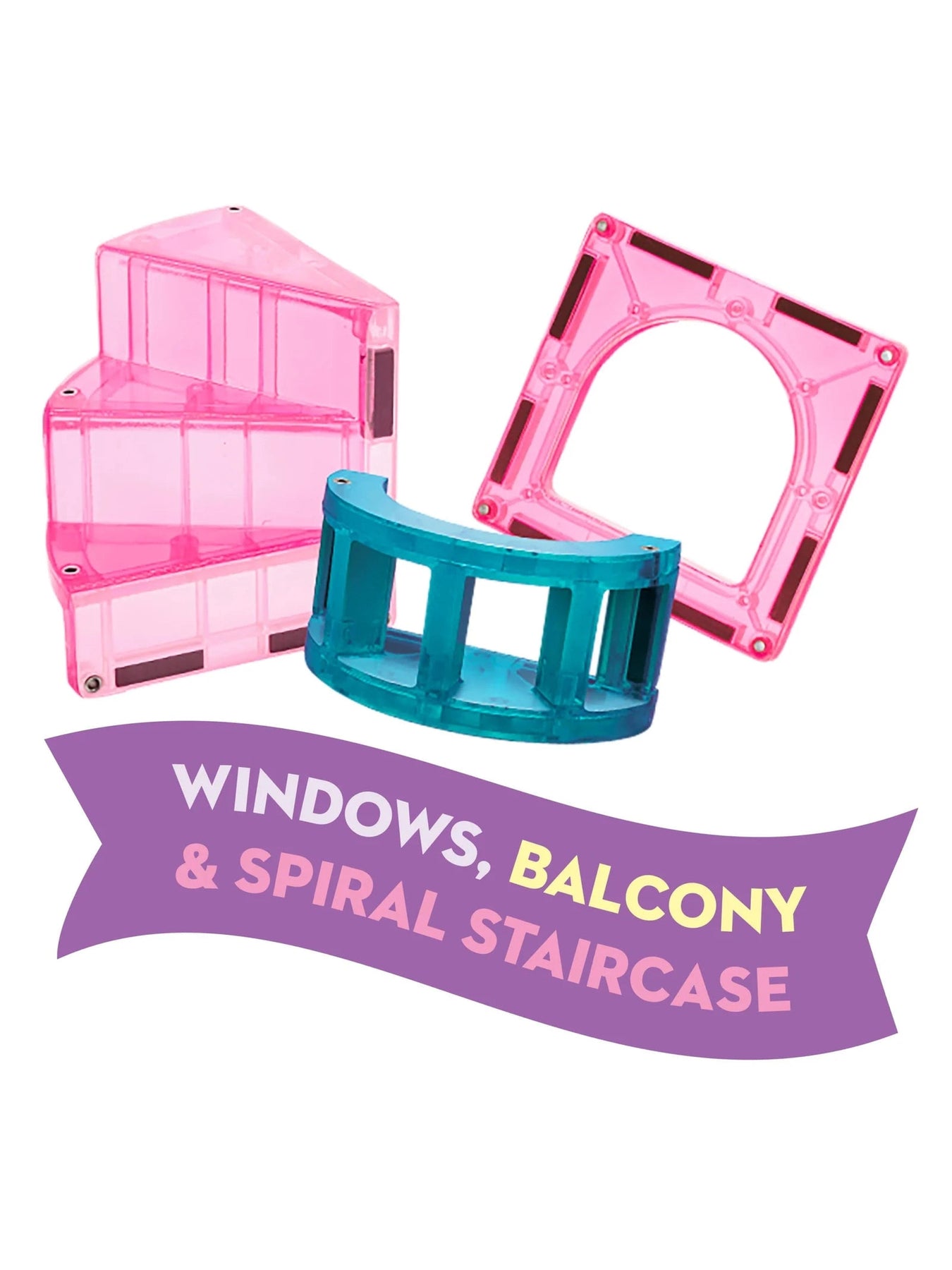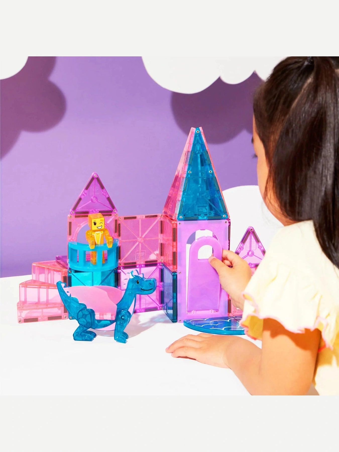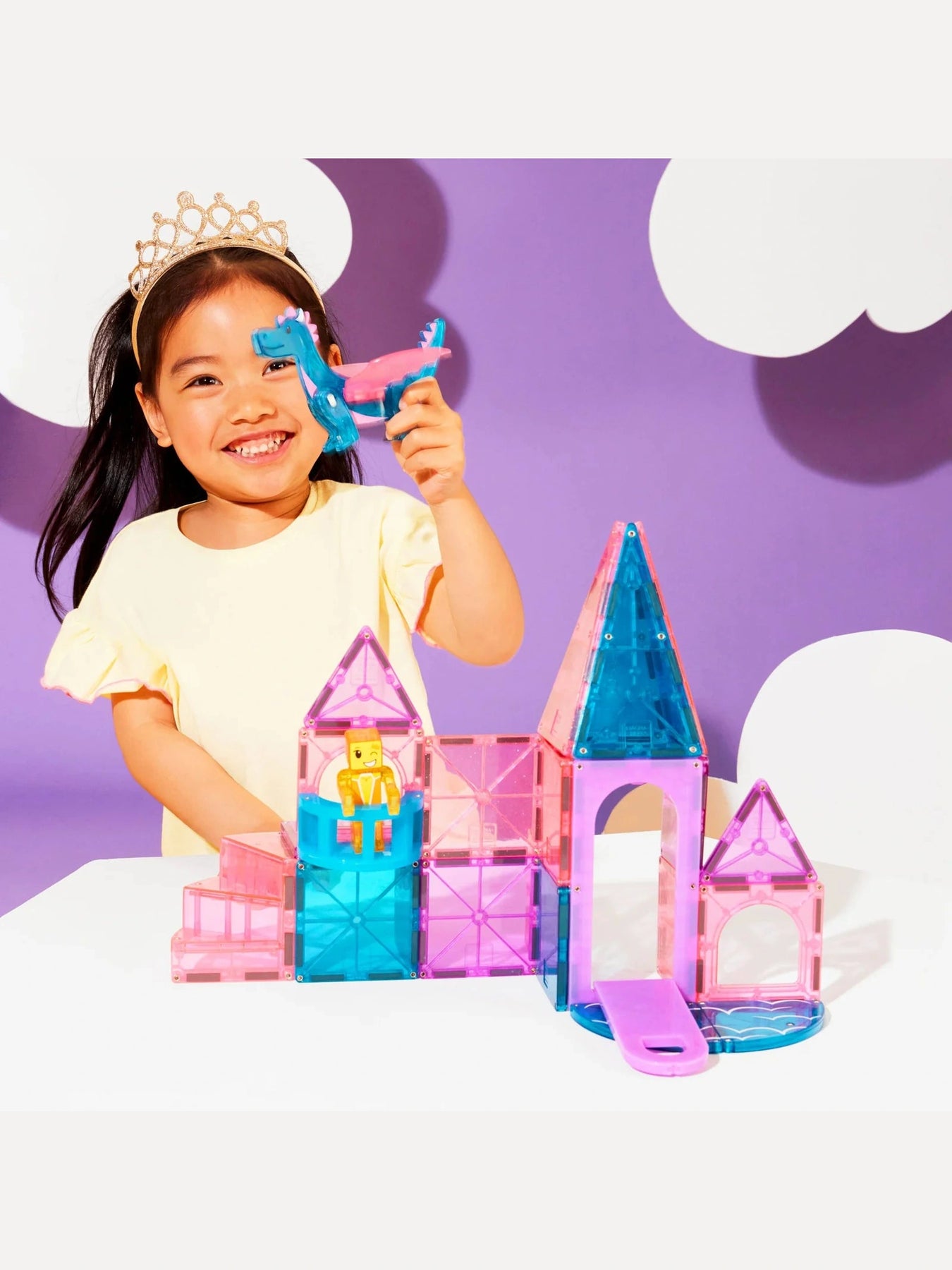 Step into a magical world with the Magna-Tiles Castle 25pc. Set! Open the working drawbridge to explore your kingdom, climb the spiral staircase, and enjoy the first-ever balcony feature. Spark imagination with the exclusive Dragon Figure and shimmering glitter tiles that add a touch of enchantment. Perfect for endless creative play, this set invites little builders to craft their own fairy tale adventures full of fun and wonder.