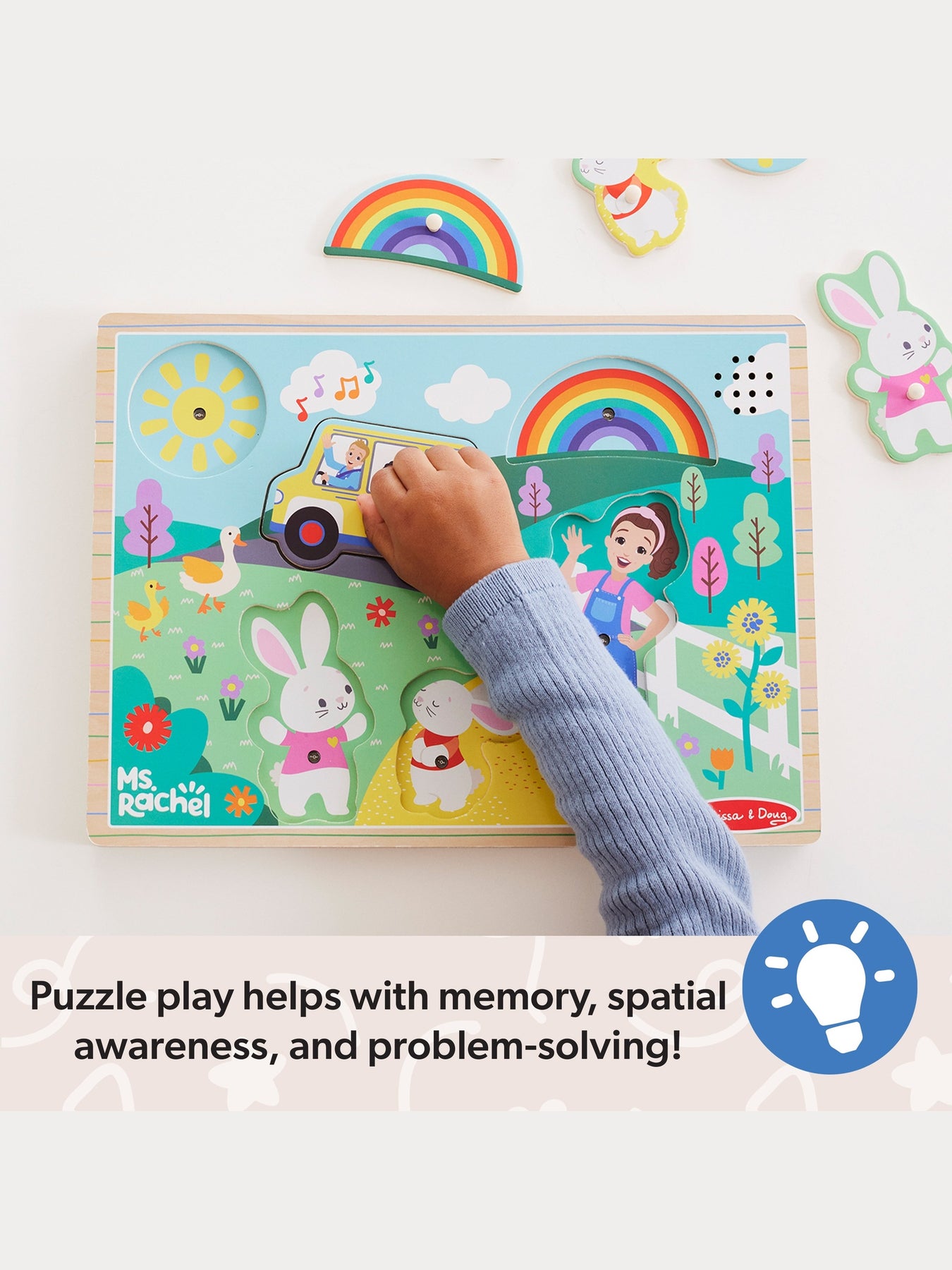 OFFICIAL MS. RACHEL TOY: Lift 6 wooden pieces with easy-to-grasp pegs to hear songs from educator Ms. Rachel (on/off switch for quiet play; 2 AAA batteries required, not included; sounds are light-activated - for best results, use puzzle in bright, direct light)