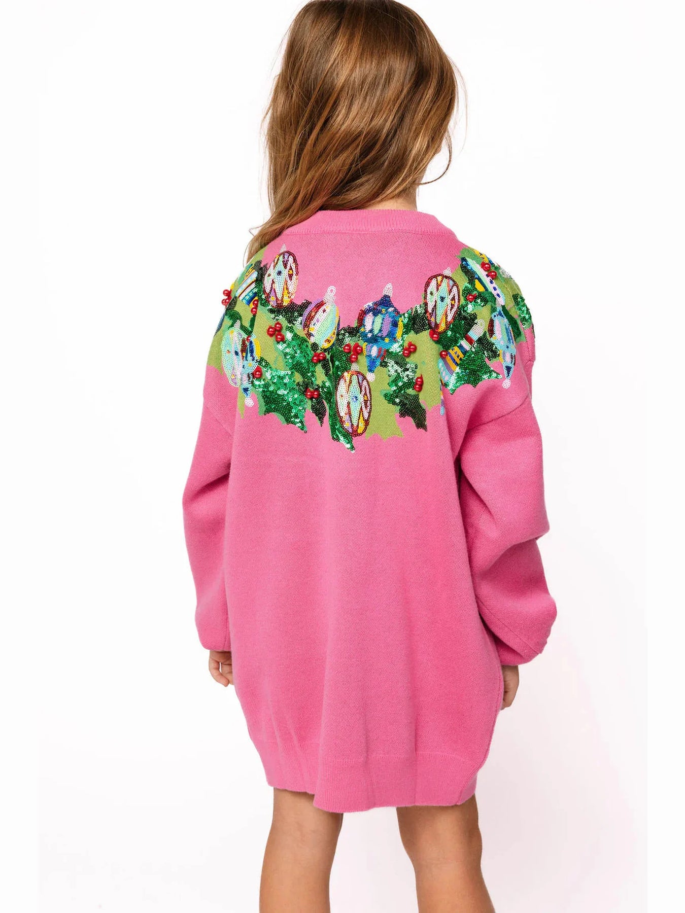 Wrap your little one in cozy charm with this delightful sweater dress! Featuring a cheerful bright pink base adorned with a festive wreath design that wraps playfully around the neckline, it's perfect for holiday celebrations or adding a pop of joy to everyday outfits. The soft, comfortable knit fabric keeps her warm while the whimsical details spark imagination and smiles. An instant favorite for special occasions or casual wear!