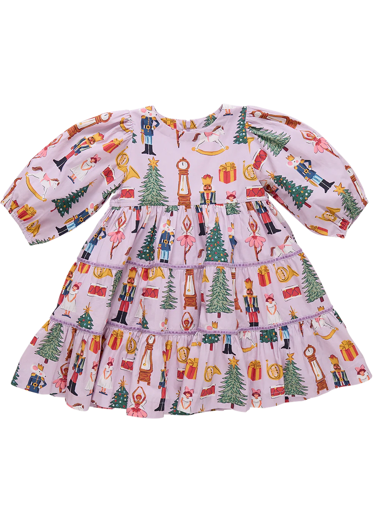 Regular price Sale price $112.00Sugarplum Dreams! Your little ballet lover will be ready to pirouette, leap and take a bow alongside everything she loves about the Nutcracker in our Girls Peachy Dress in Lavender Nutcracker. This swingy triple tiered silhouette features lavender velvet taping at the tiers a 3/4 puff sleeve sleeve and an invisible zipper at the back. Match back to Baby Sis in our Baby Girls Charlie Jumper.