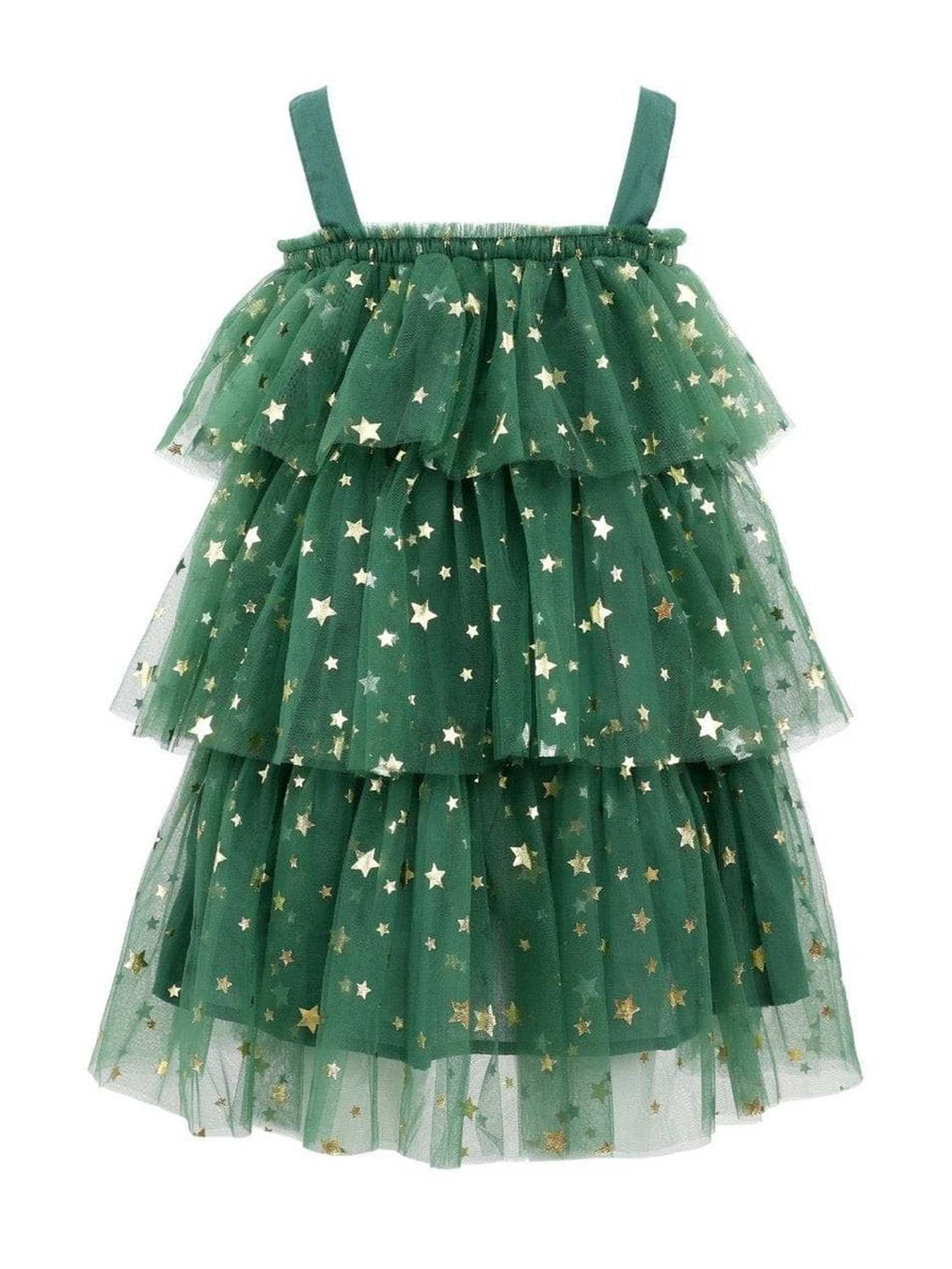 • Enchanting layered tulle dress adorned with shimmering gold star details