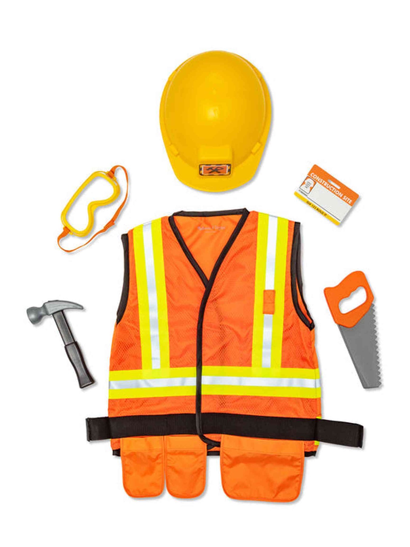 • Includes vest with tool belt, hard hat, goggles, hammer, saw and name tag for pencil personalization.