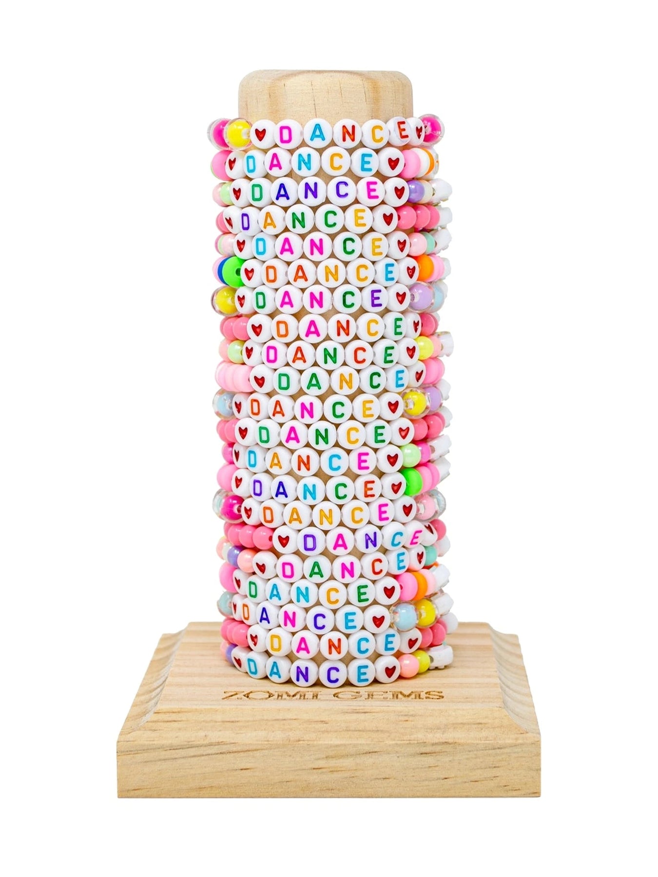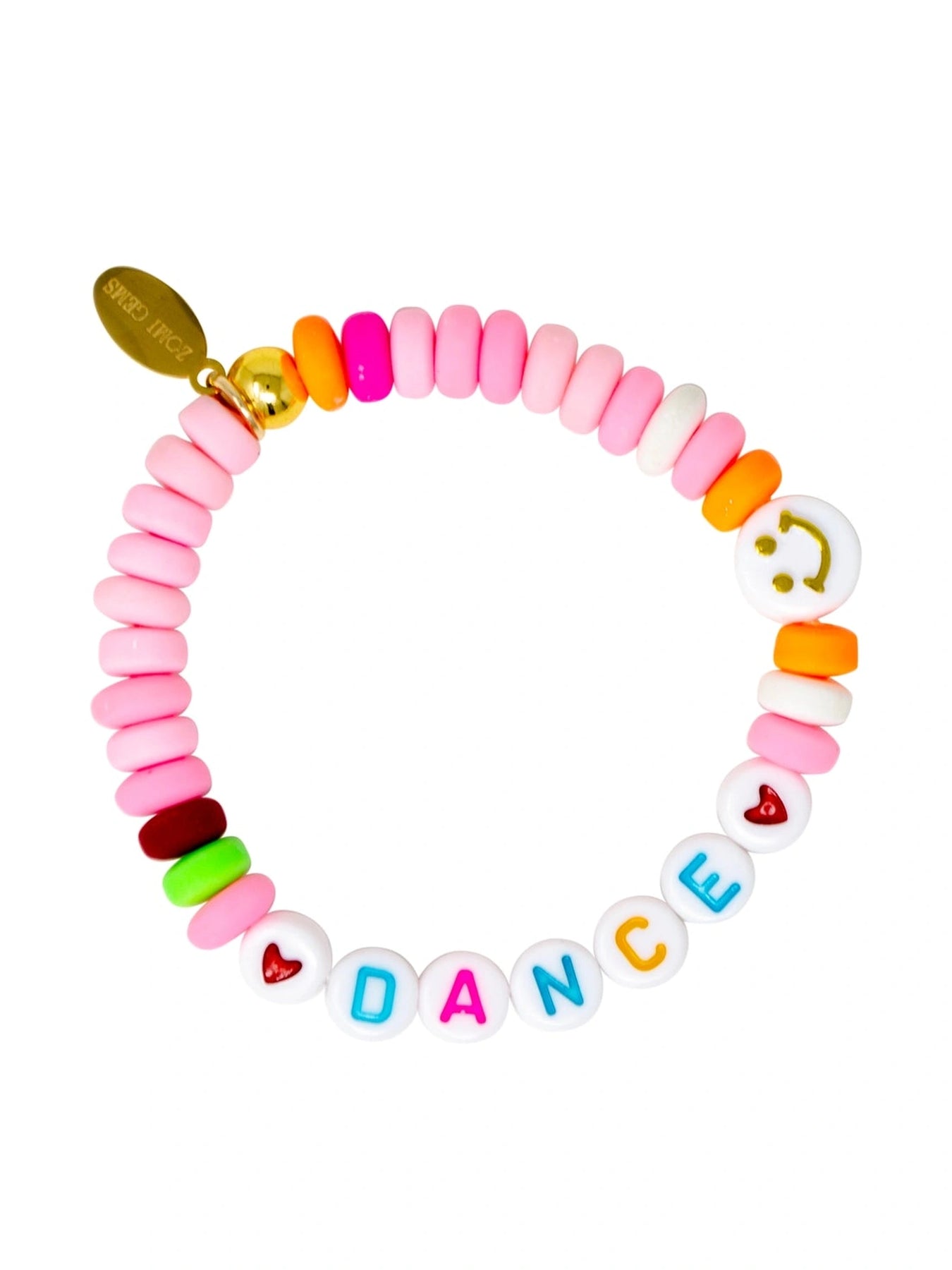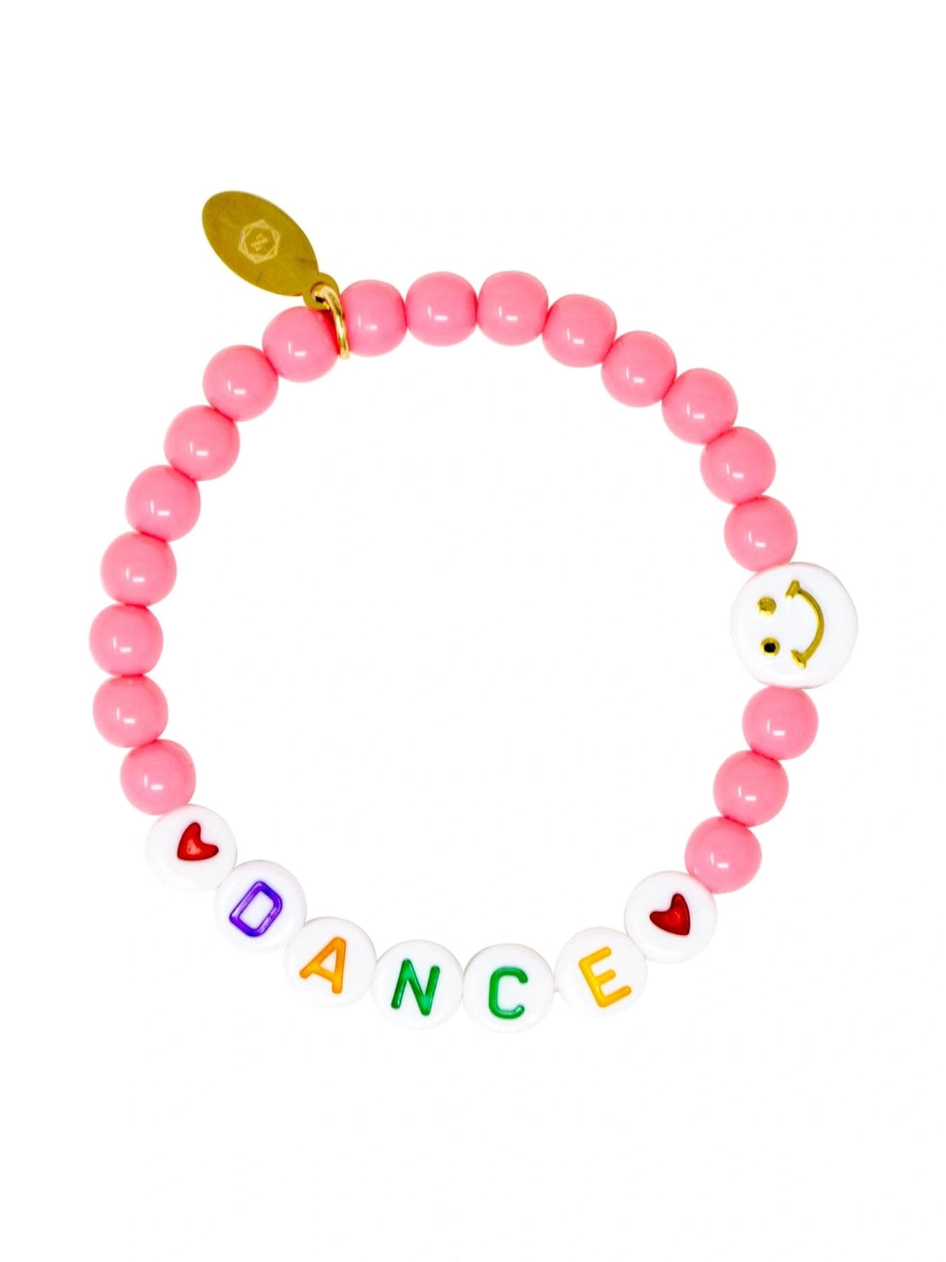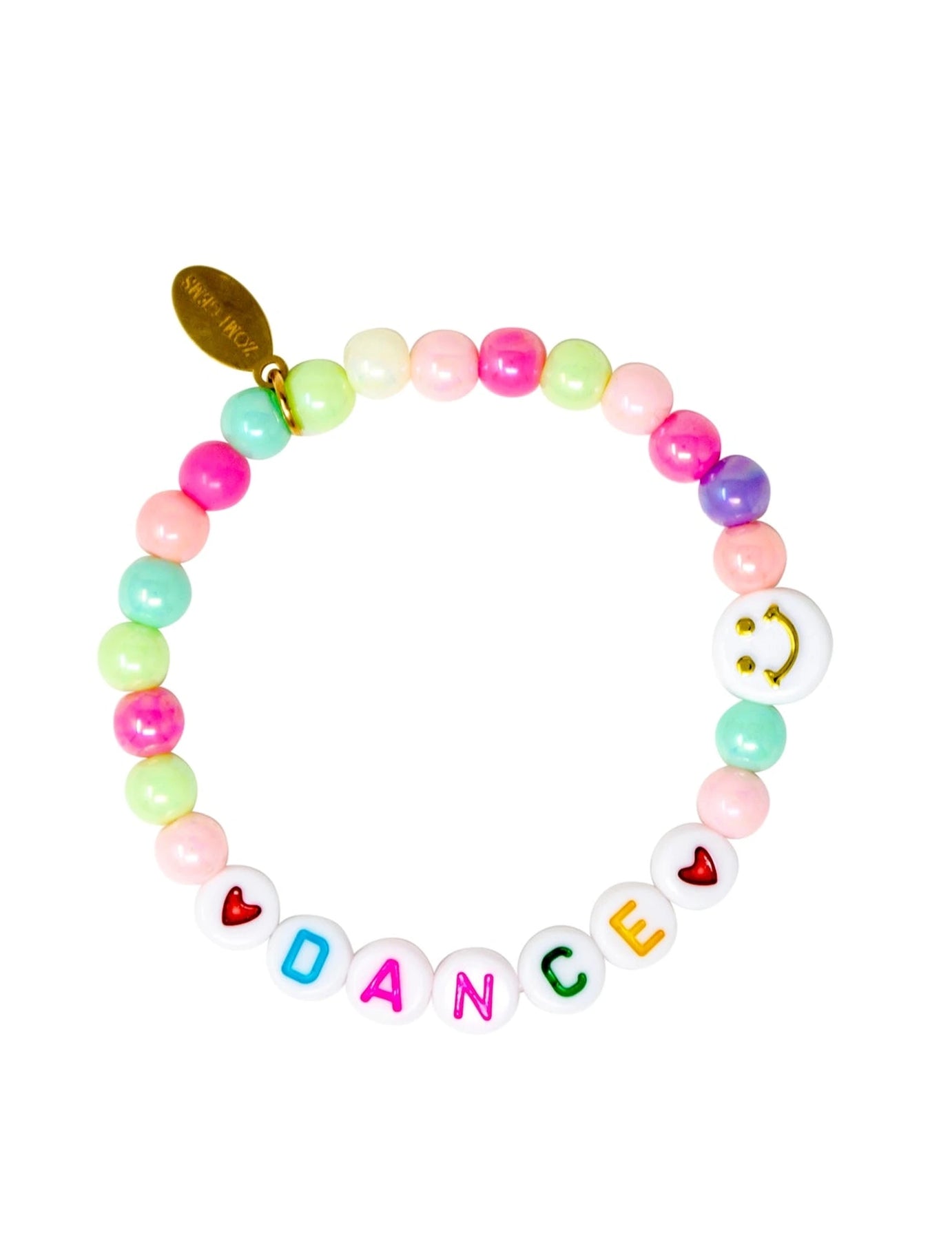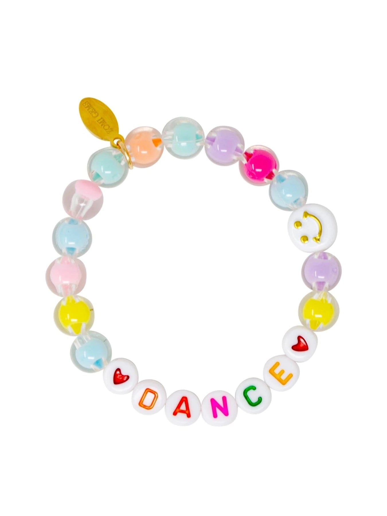 The happy face and dance bead bracelet is a fun and cheerful accessory that is perfect for adding a pop of color and personality to any outfit. The bracelet features a combination of bright, colorful beads in various shapes and sizes, including beads with happy face designs and letter beads which spell out "dance."