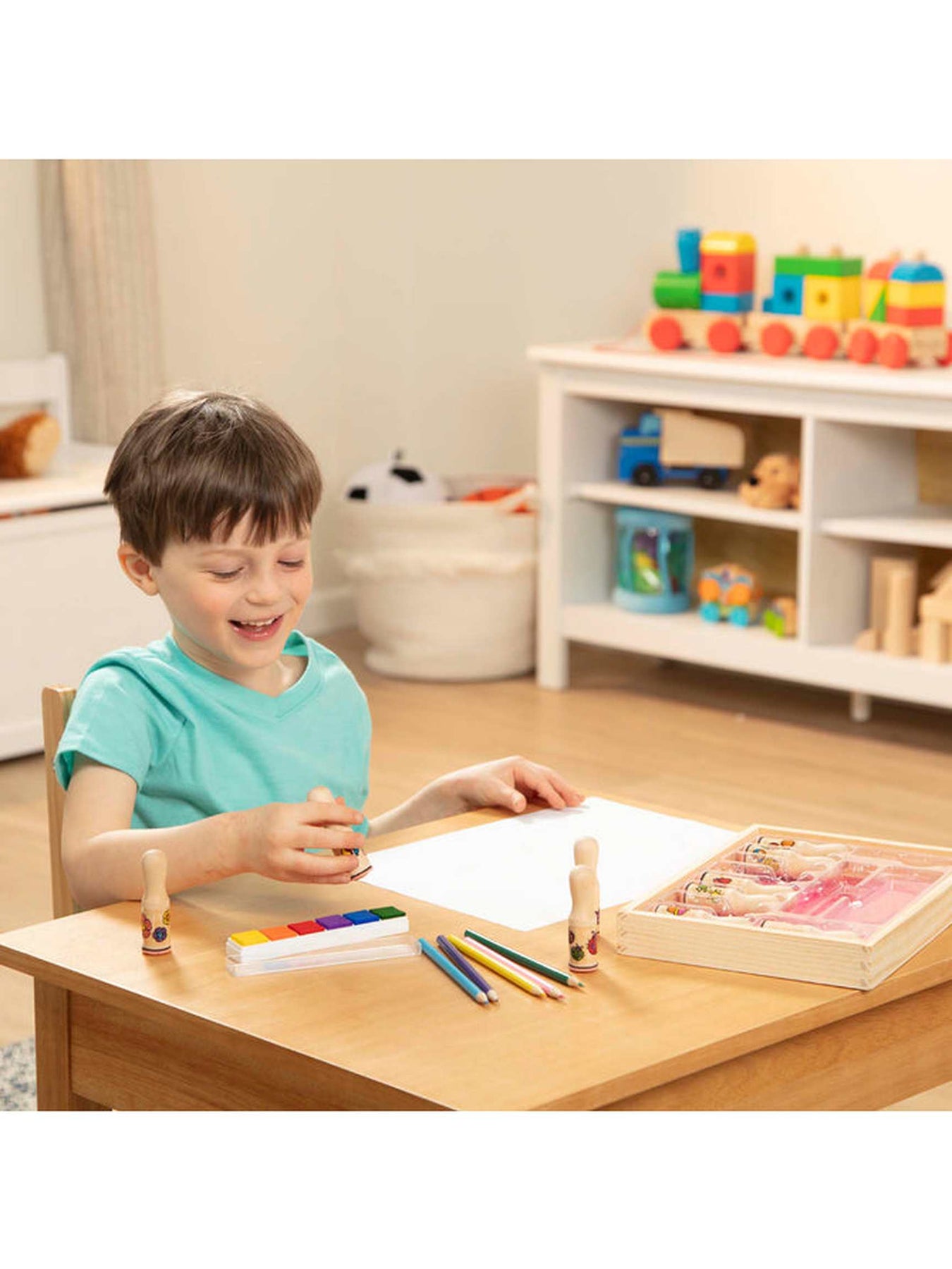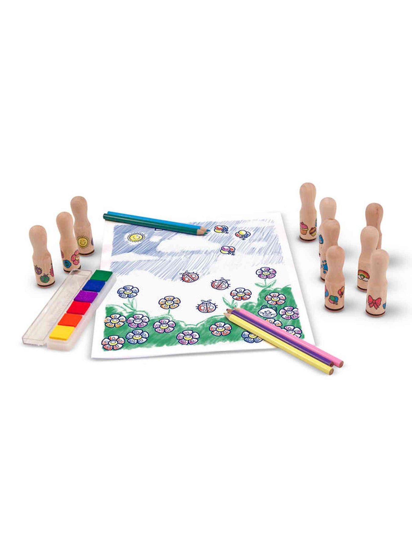 • Includes 6-color ink pad with washable ink, 5 colored pencils, and sturdy wooden storage tray.
