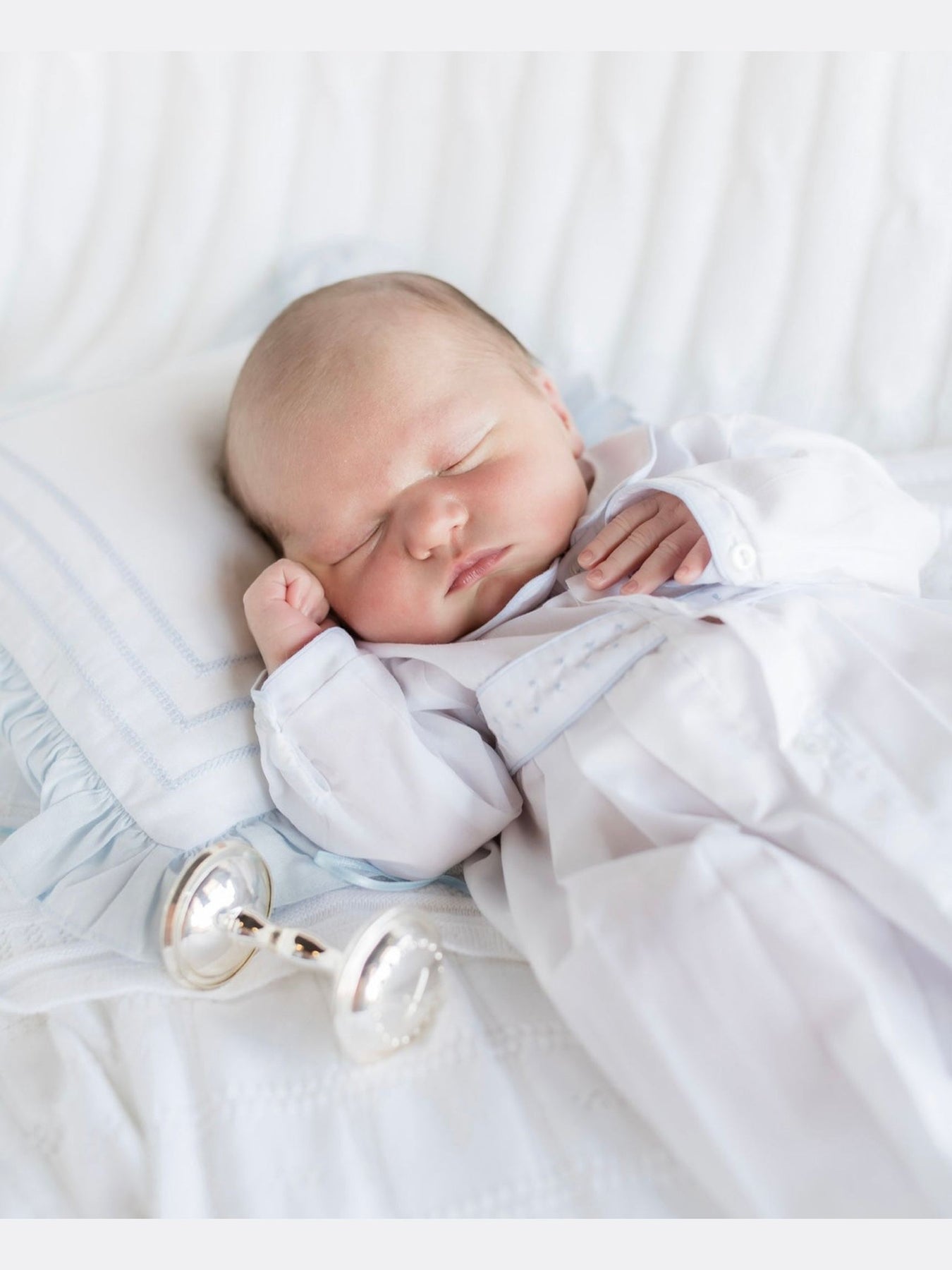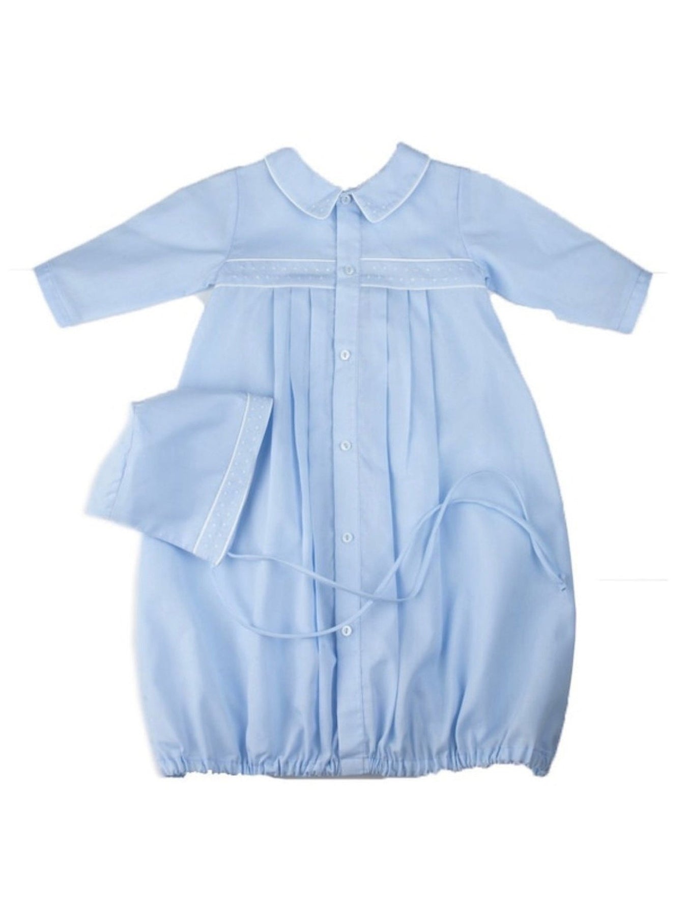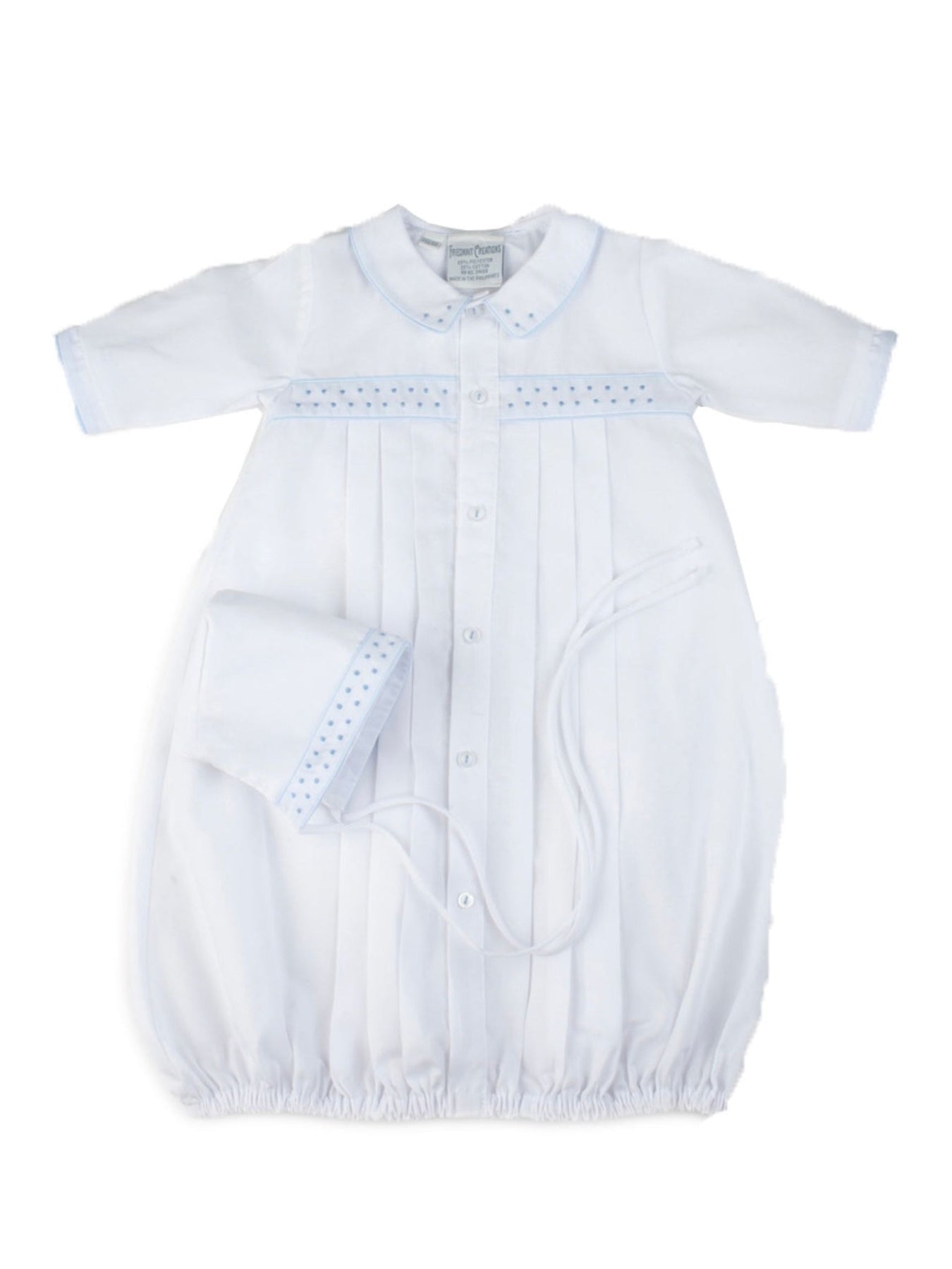 Sweet, sharp, and oh so classy. This take me home set for boys from Friedknit Creations from Feltman Brothers is sure to become a treasured family favorite, with its beautiful detailing and excellent heirloom quality. Available in either blue on white or white on blue, with contrasting colors on the piping lining the collar, cuffs, and bodice, as well as in the hand embroidered design. Dainty dot embroidery decorates the collar, bodice, and matching hat. Three stiff pleats go down the length of the piece on either side of the button placket. Dress your loved one in this precious take me home gown and watch as the compliments start rolling in!
