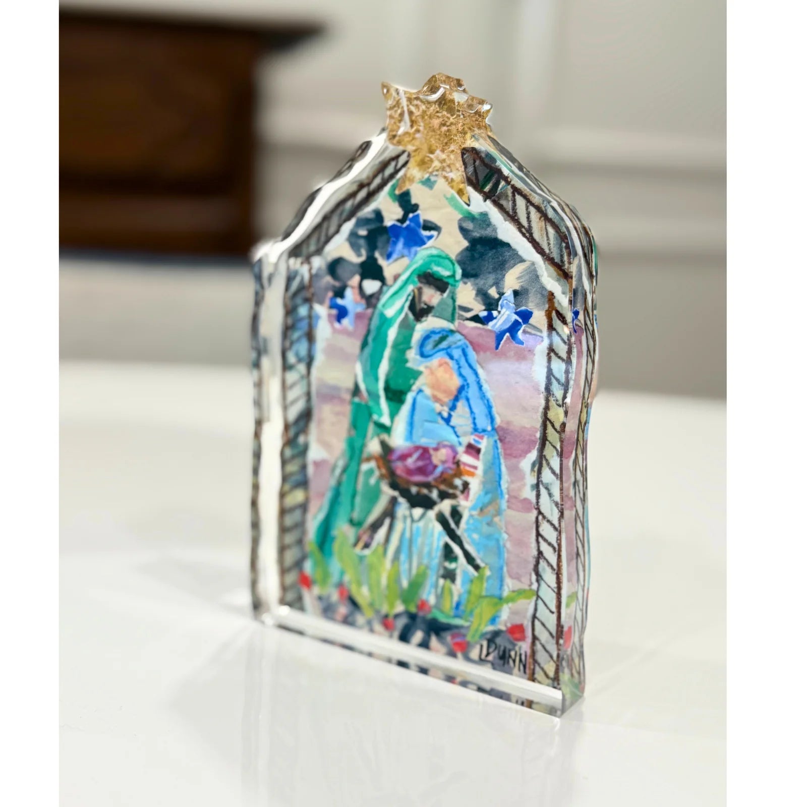 Lauren's representation of the humble birth of Jesus artistically captures Mary, Joseph, and baby Jesus in a silhouette-style acrylic print, blending simplicity with sacred meaning.