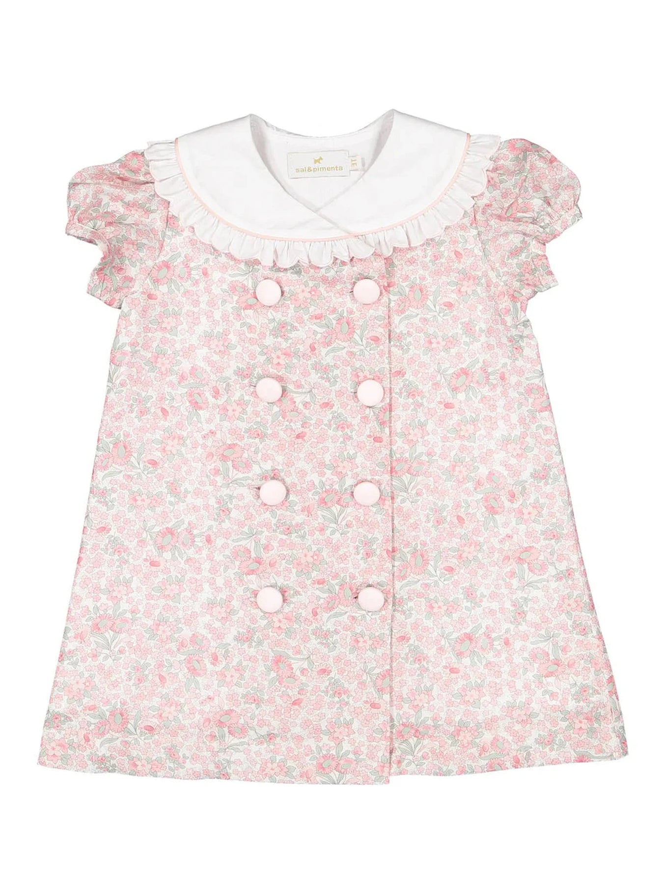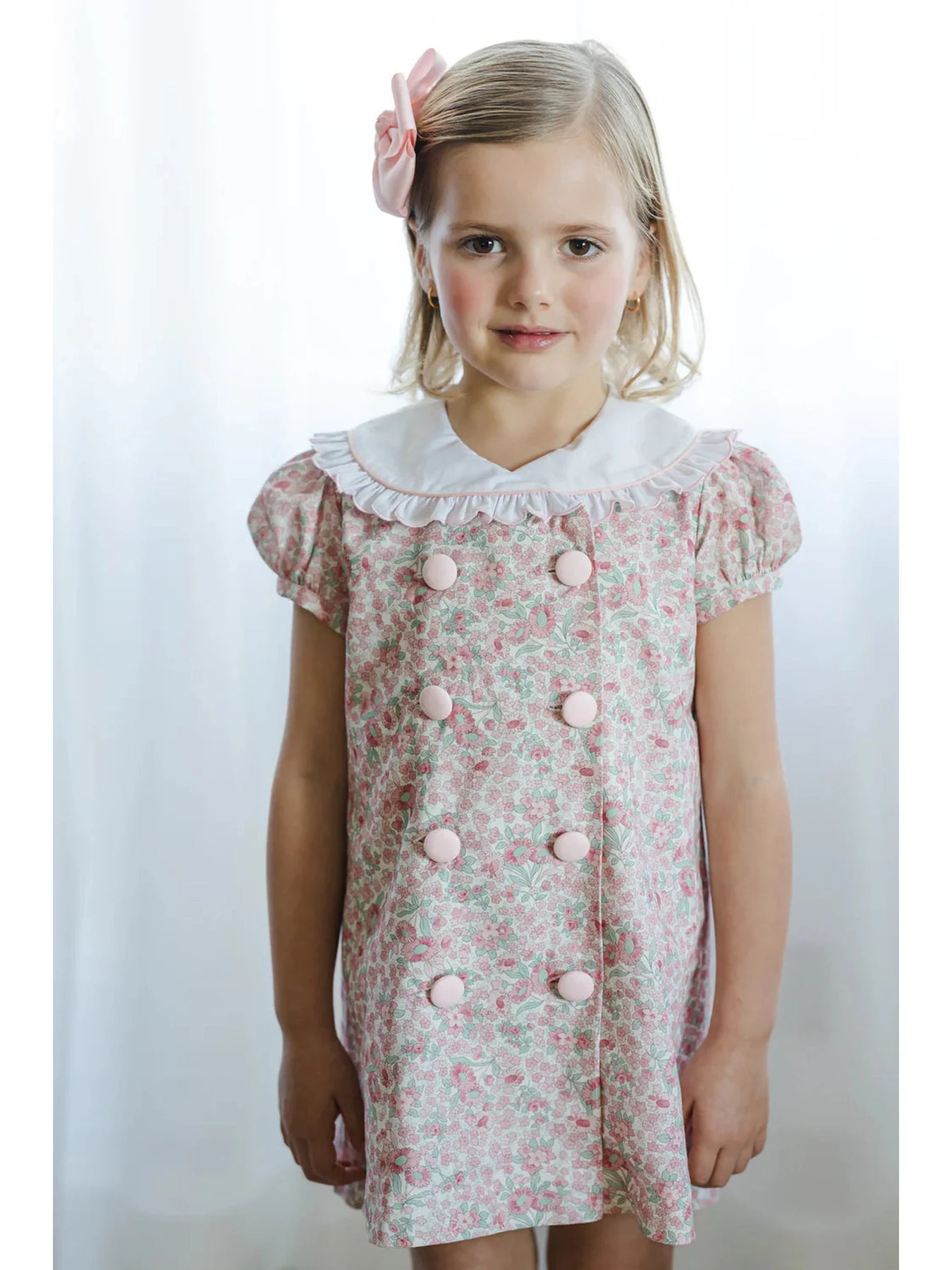 This charming dress brings springtime vibes to any little one's wardrobe! Featuring a delicate pink floral print and a classic button-front design, it's perfect for playdates, family gatherings, or everyday adventures. The crisp collared neckline adds a polished touch while keeping things fun and comfortable. Easy to dress up or down, this sweet piece is a wardrobe essential that'll have her twirling with joy.